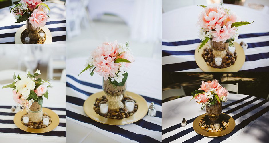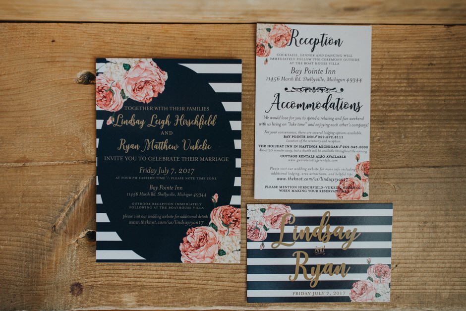 The decor was simple and if I had to describe it, I would call it “nautical chic”. The venue was already beautiful, being lakeside and the backdrop was Gun Lake. They already had so much beautiful foliage and flowers, I didn’t want to overdo it. The colors were gold, navy, and blush. I made everything myself and had the help of a few family members and friends along the way, including the day of, to set everything up. So lucky to have a great group of family and friends!