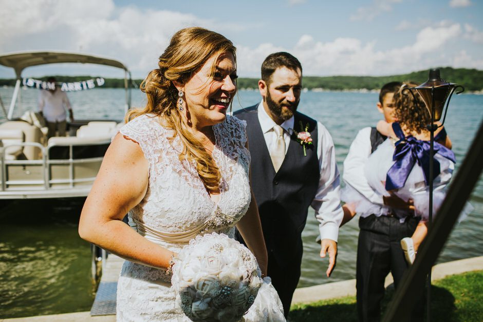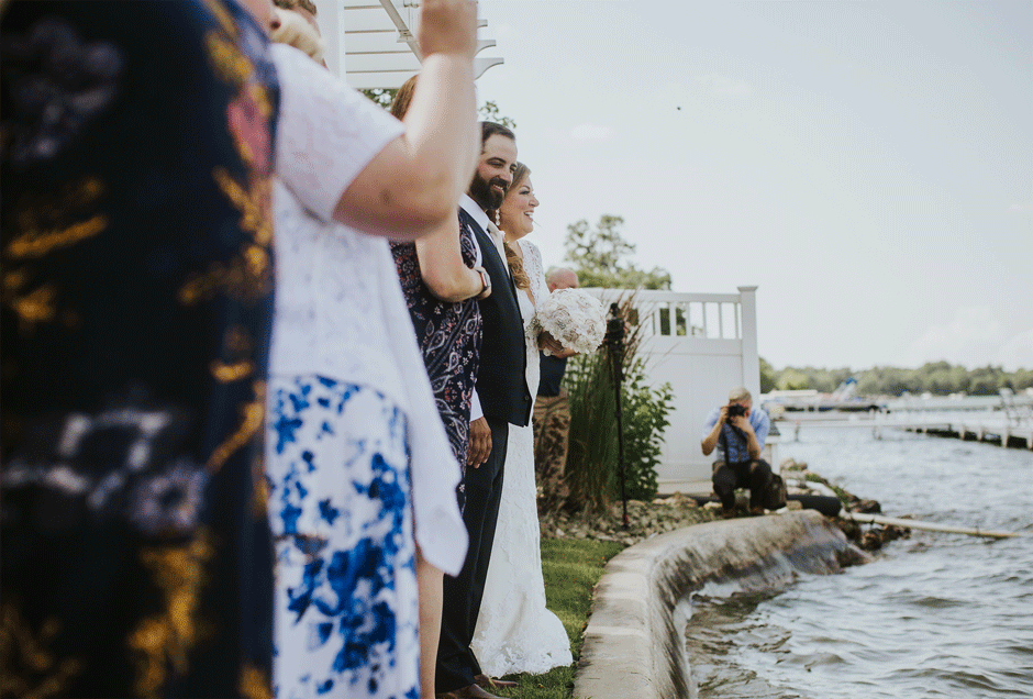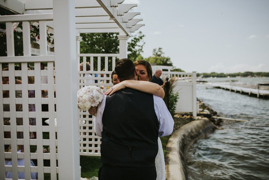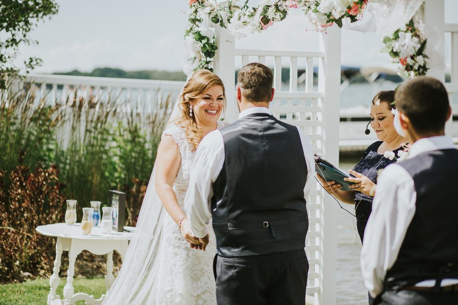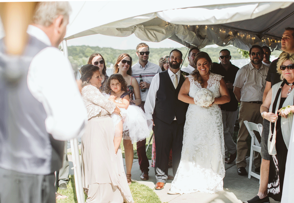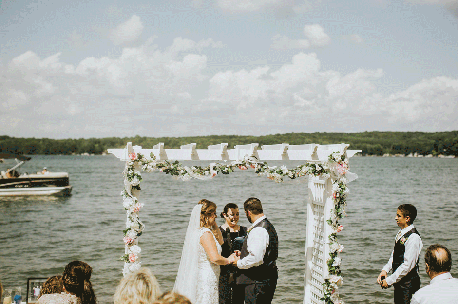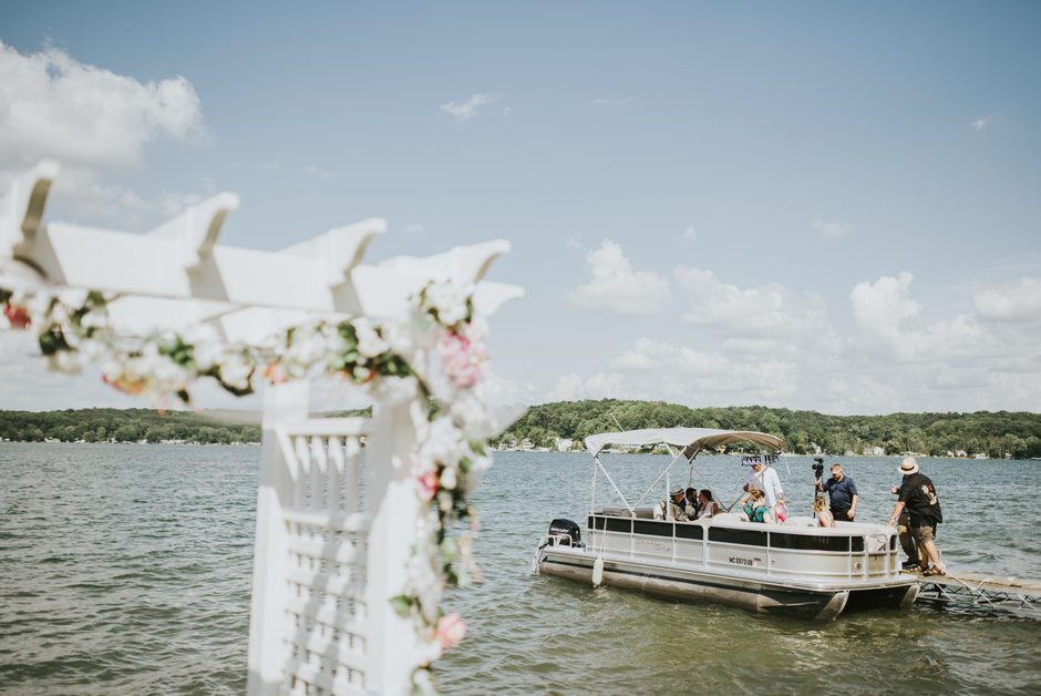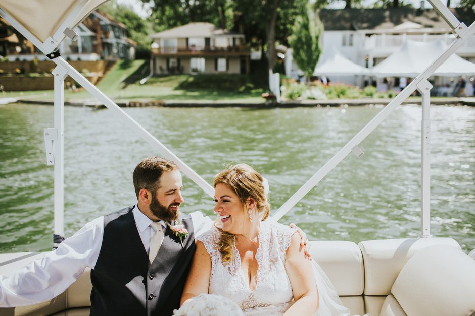 The ceremony was my absolute favorite part of the day. We wanted it to include not only Ryan and I joining our lives and our children’s lives, but also all of our “people”. We did not have a bridal party, so we had our kids alongside us. I asked my best friend from childhood, Erin Roenna to officiate and lucky for us, she agreed! Erin did such an amazing job of incorporating emotion, humor, and sentiment into the perfect ceremony. I don’t think I could have asked for a better ceremony. We performed a sand ceremony to unite our lives and included Jake and Lia. “These grains of sand are now mixed together and can never be separated.” The other thing we did was a “blessing stone ceremony”. All of our guests were given a river rock to hold during our ceremony. At the end, everyone was asked to make a wish or blessing for our marriage on their rock and we all threw them into the lake at the same time. As Erin explained “The ripples that are made in the water represent the love and good wishes not only for this couple but for all the world. For as our ripples cross and recross one another’s, so our love and good wishes touch and retouch all those around us.” We then exited the ceremony on a pontoon boat!