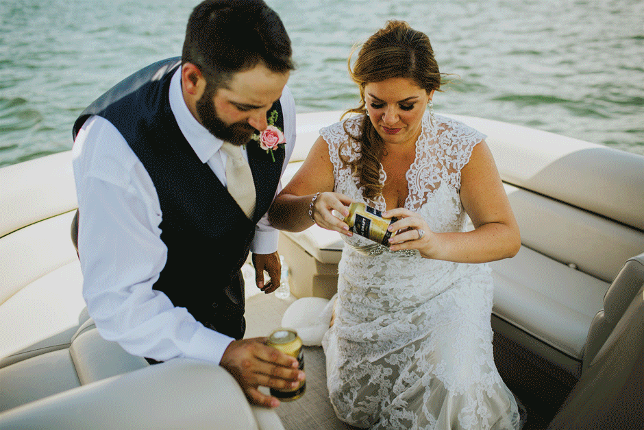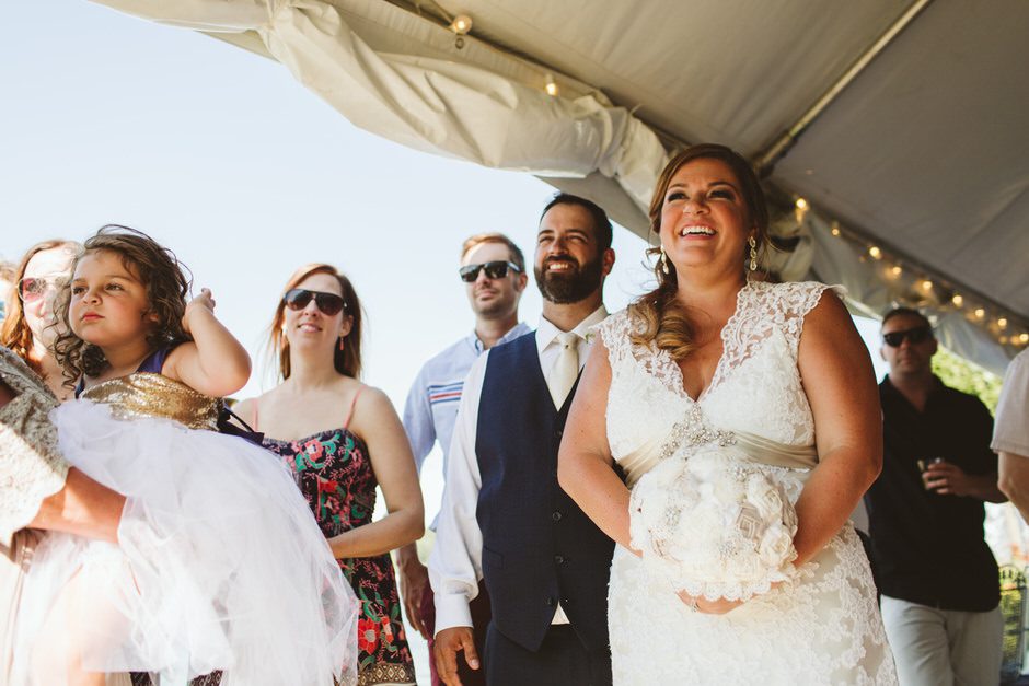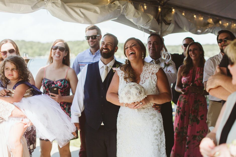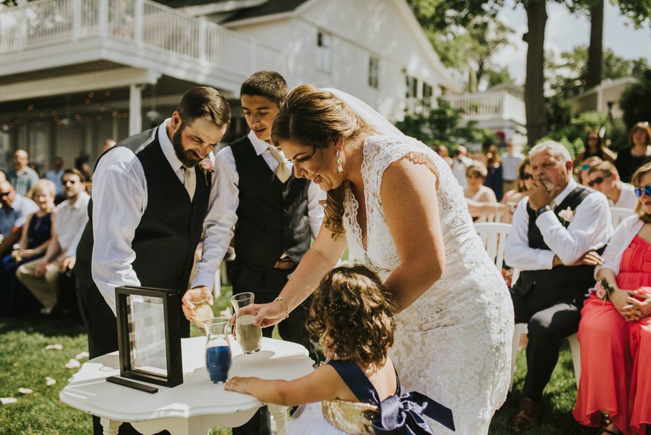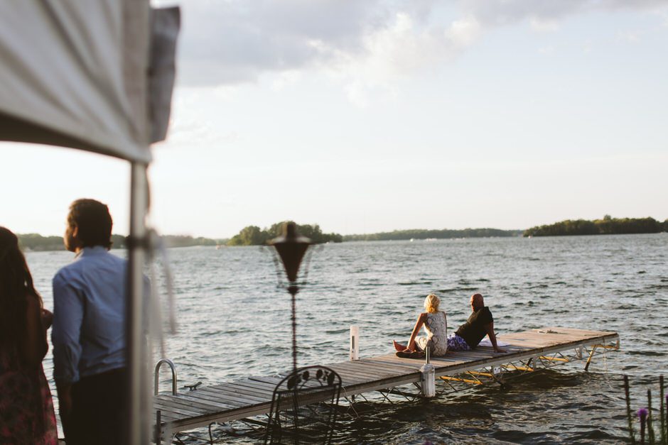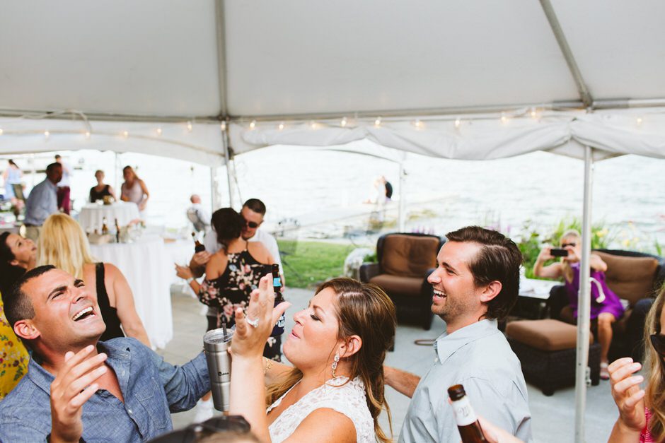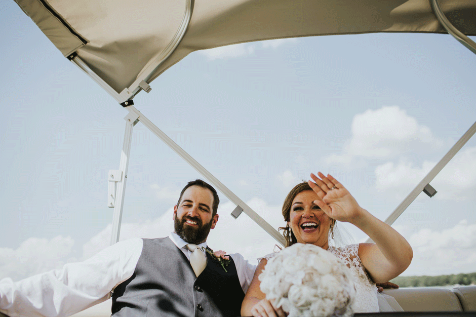 The ceremony was my absolute favorite part of the day. We wanted it to include not only Ryan and I joining our lives and our children’s lives, but also all of our “people”. We did not have a bridal party, so we had our kids alongside us. I asked my best friend from childhood, Erin Roenna to officiate and lucky for us, she agreed! Erin did such an amazing job of incorporating emotion, humor, and sentiment into the perfect ceremony. I don’t think I could have asked for a better ceremony. We performed a sand ceremony to unite our lives and included Jake and Lia. “These grains of sand are now mixed together and can never be separated.” The other thing we did was a “blessing stone ceremony”. All of our guests were given a river rock to hold during our ceremony. At the end, everyone was asked to make a wish or blessing for our marriage on their rock and we all threw them into the lake at the same time. As Erin explained “The ripples that are made in the water represent the love and good wishes not only for this couple but for all the world. For as our ripples cross and recross one another’s, so our love and good wishes touch and retouch all those around us.” We then exited the ceremony on a pontoon boat!