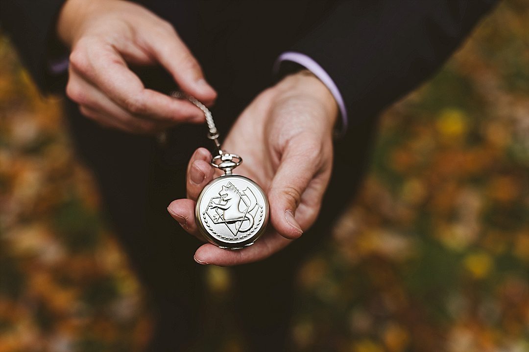 The suit I was wearing at the wedding was actually bought so I could officiate my sisters wedding, which I wore when I did. My ring was given to me by my mother and is my father’s wedding ring. My dad passed in 2016 so I meant a lot to have something like that incorporated into the wedding. Also, a fun side note, my silver pocket watch was a replica of Edward Elric’s state alchemist pocket watch from full metal alchemist.