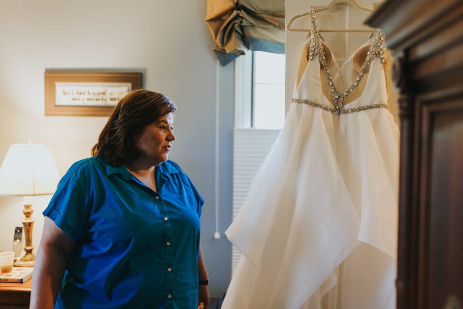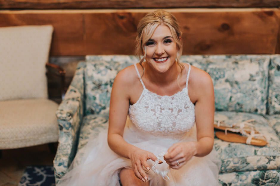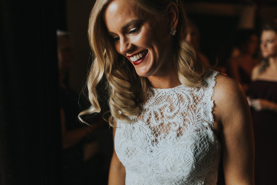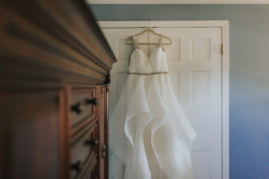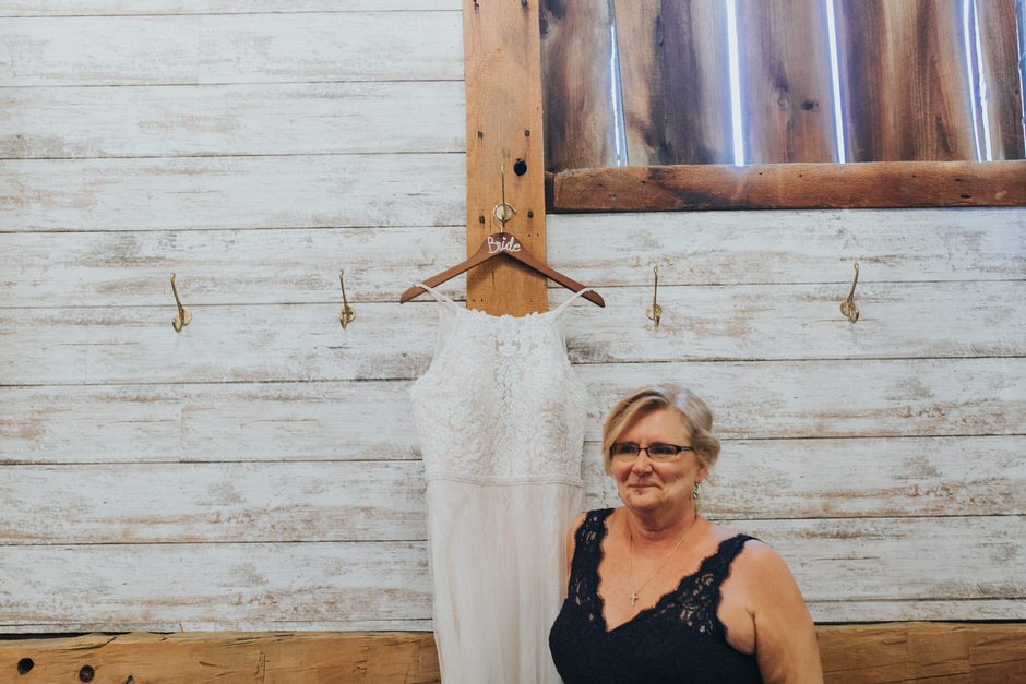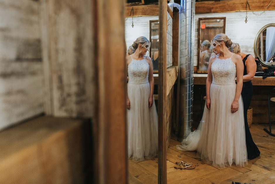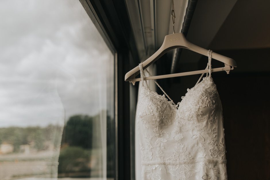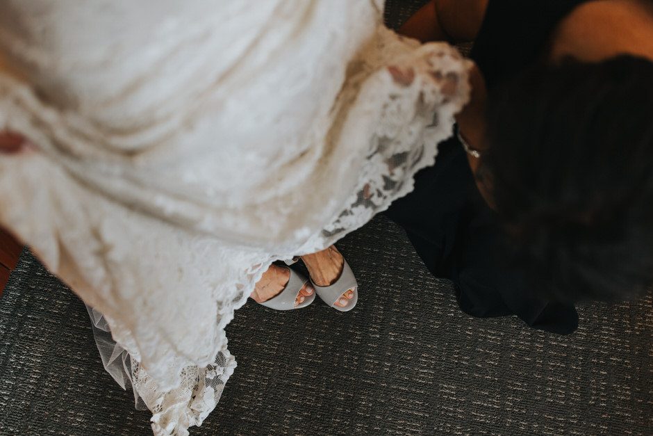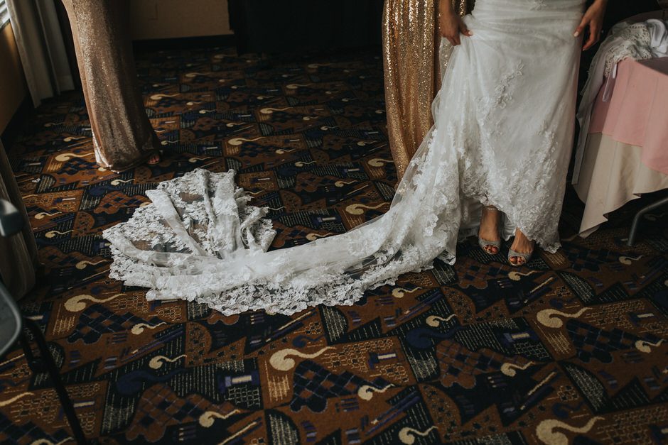 I got my dress at The Wedding Shoppe in Berkley, Michigan. It was just my mom and I that day, which was nice, because I knew she would give me her honest opinion and I wouldn’t have a crowd of people swaying my decision. It was my first time trying on wedding dresses and I knew I wanted to find something I was comfortable in so that I could dance and have fun on my wedding night. I tried on several dresses, but something about this dress made me feel so amazing. I loved that it was traditional in that it was ivory lace with a long train. But also loved how the off the shoulder style and low back made it a little edgy. I also couldn’t help but think of Brad’s face the first time he’d see me in the dress.