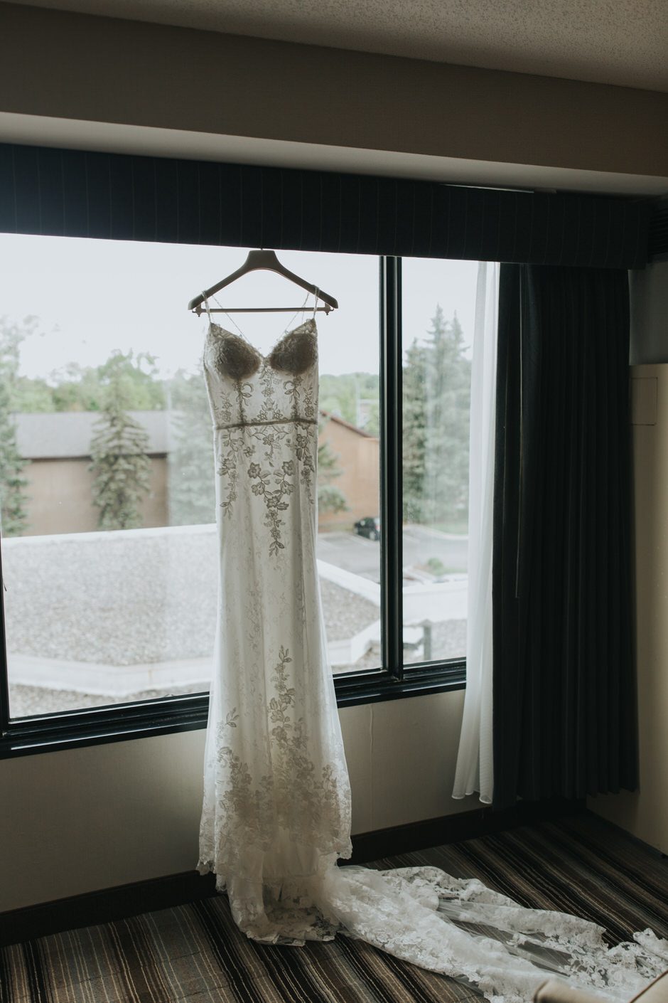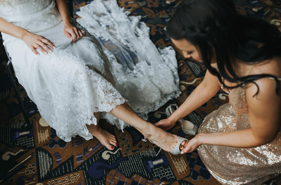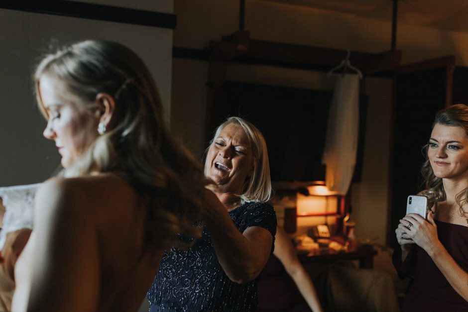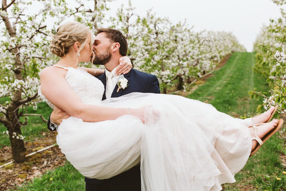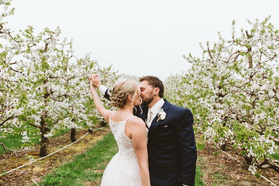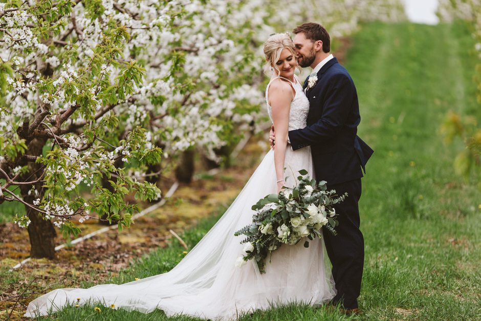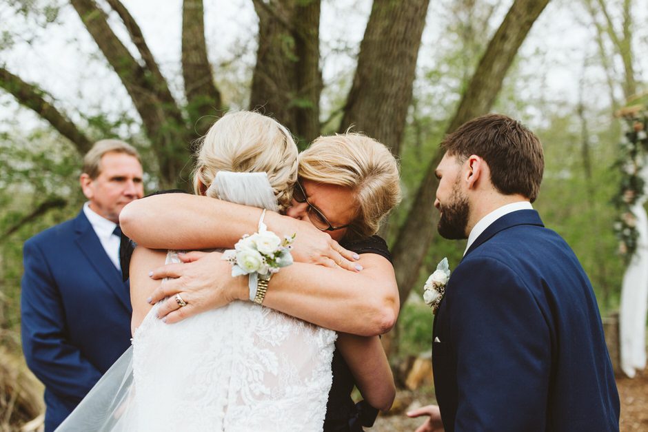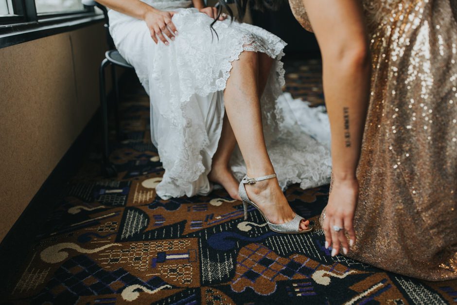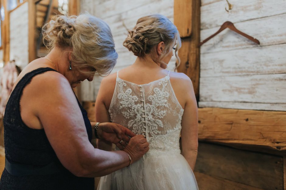 I got my dress at The Wedding Shoppe in Berkley, Michigan. It was just my mom and I that day, which was nice, because I knew she would give me her honest opinion and I wouldn’t have a crowd of people swaying my decision. It was my first time trying on wedding dresses and I knew I wanted to find something I was comfortable in so that I could dance and have fun on my wedding night. I tried on several dresses, but something about this dress made me feel so amazing. I loved that it was traditional in that it was ivory lace with a long train. But also loved how the off the shoulder style and low back made it a little edgy. I also couldn’t help but think of Brad’s face the first time he’d see me in the dress.