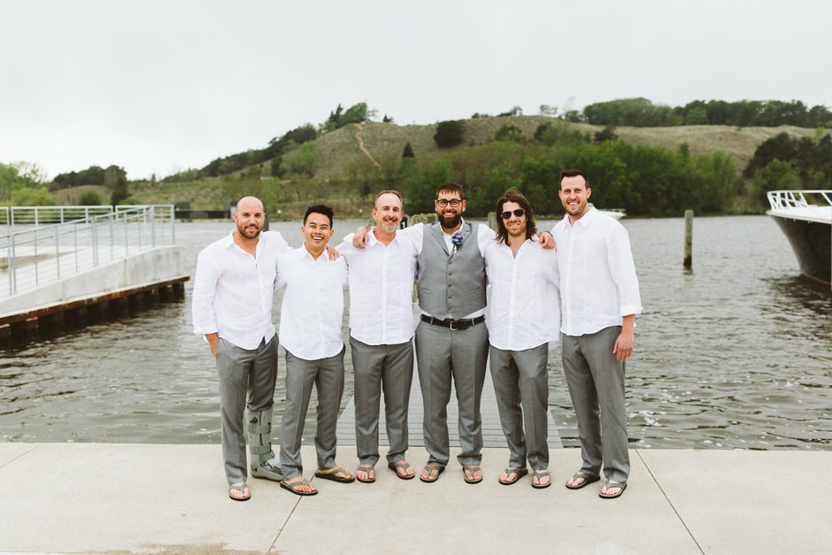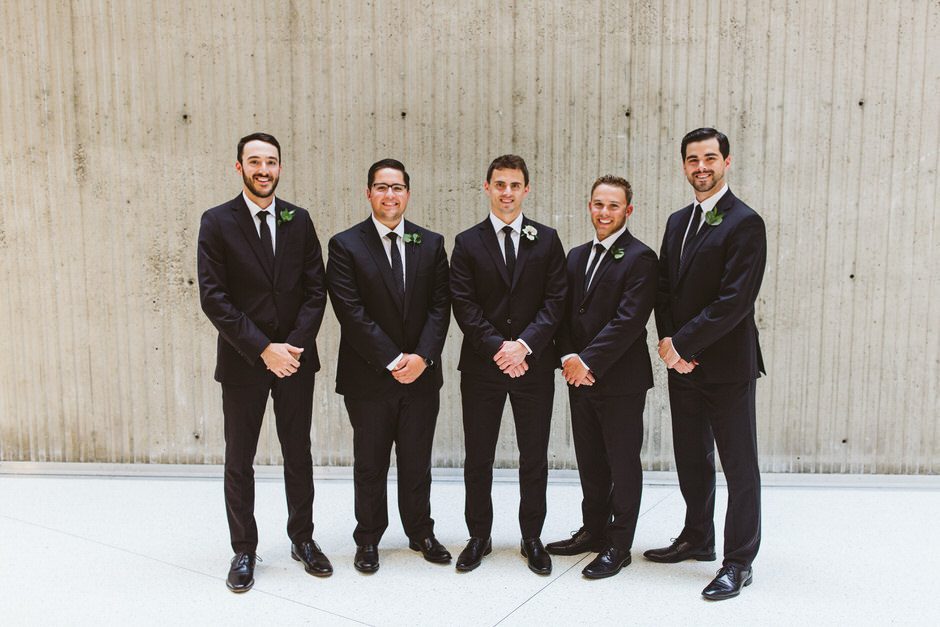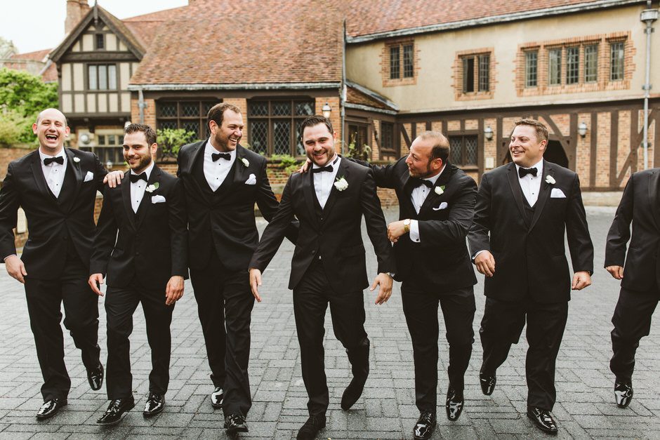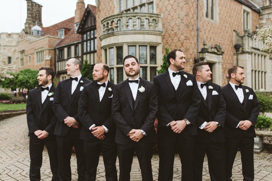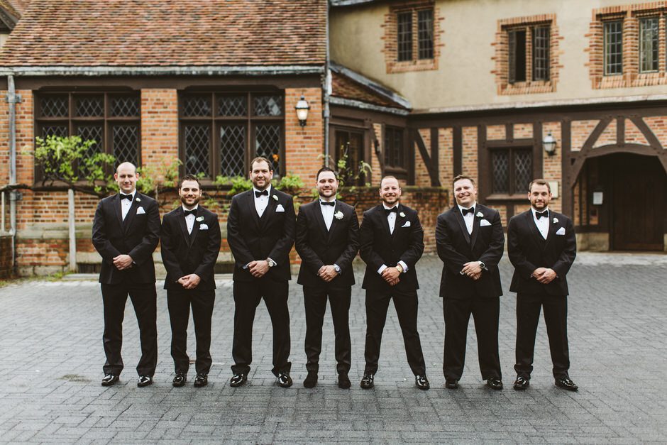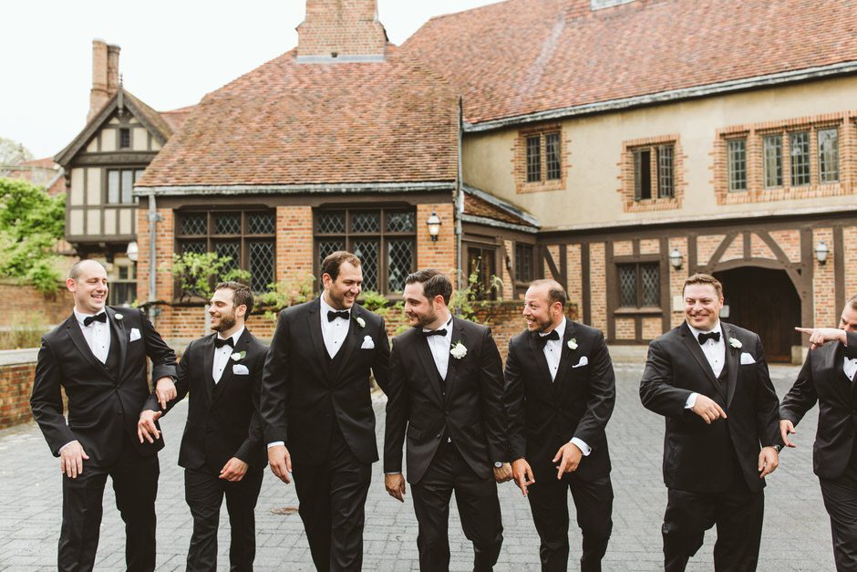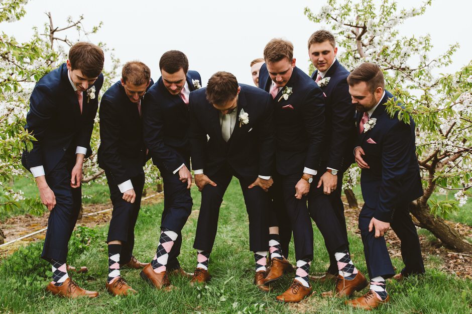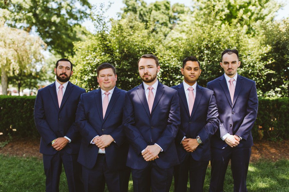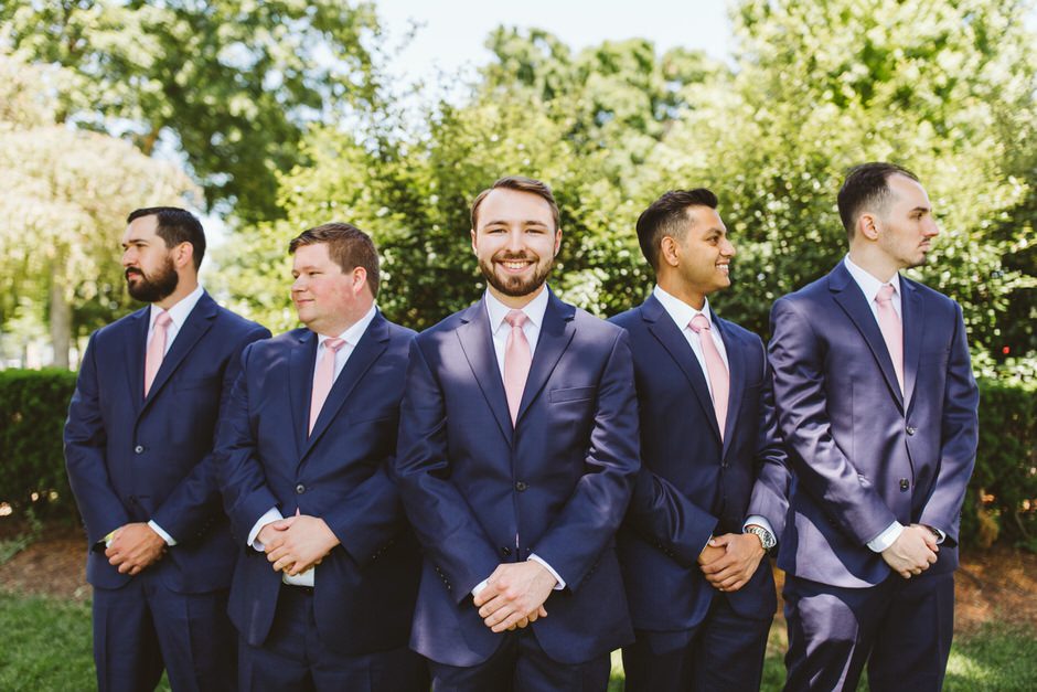 Brad and his groomsmen wore a black suit by Calvin Klein with Penguin gingham skinny ties. He knew he wanted something classic, but also something versatile that he and the guys could wear again one day. They wore State and Liberty dress shirts, which was perfect because it ended up being 90 degrees and humid that day. He surprised the groomsmen with custom embroidered dress socks with their initials the night before the big day.