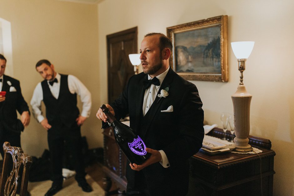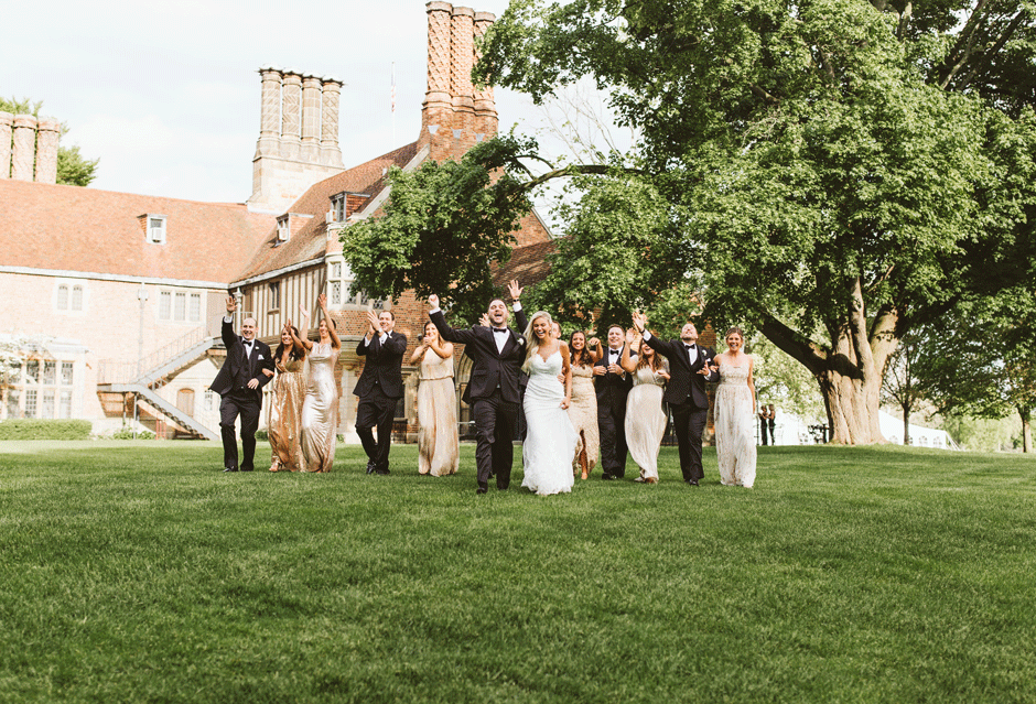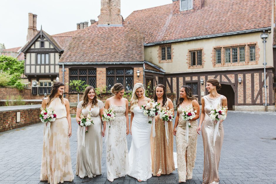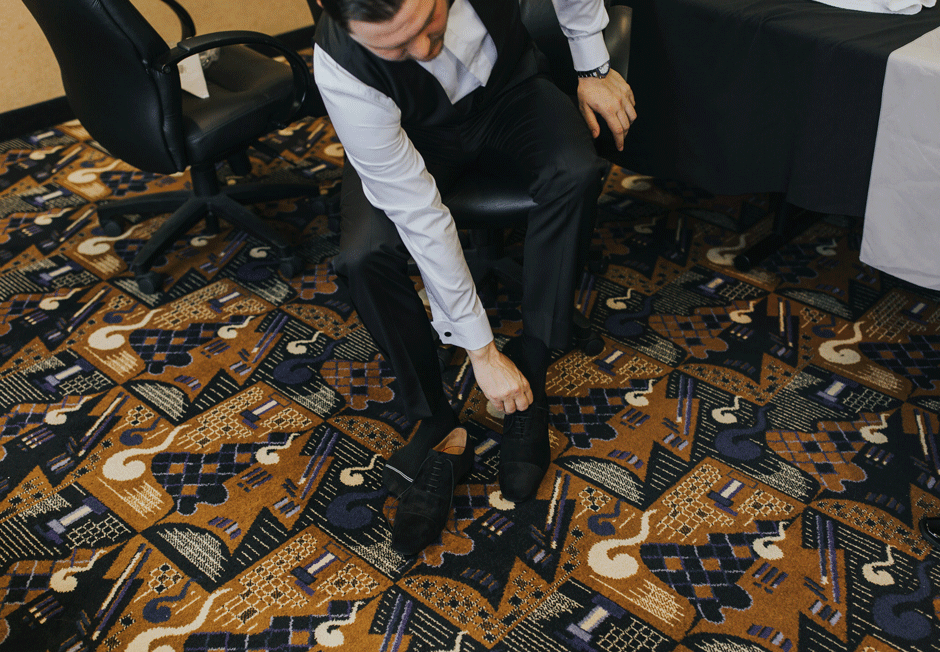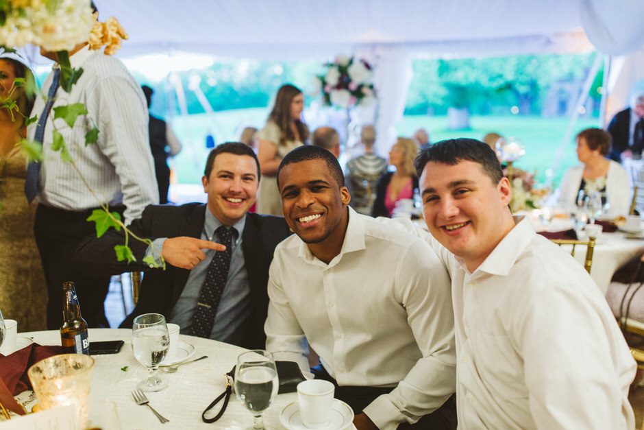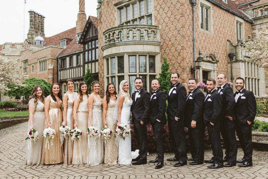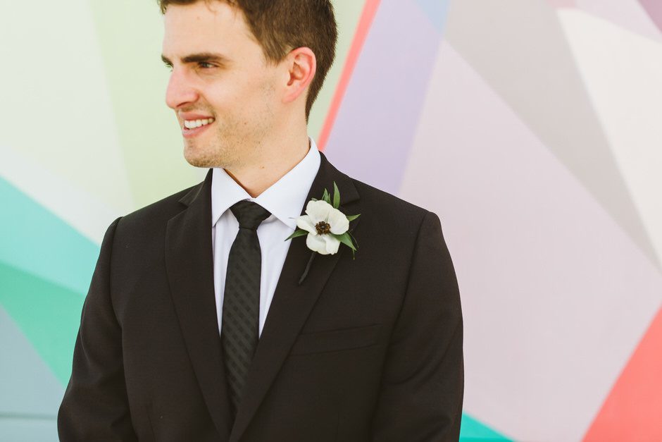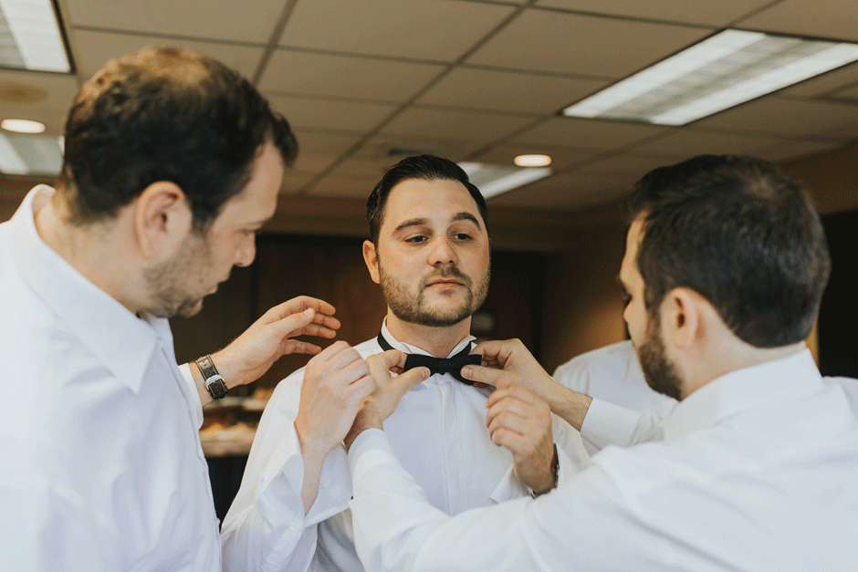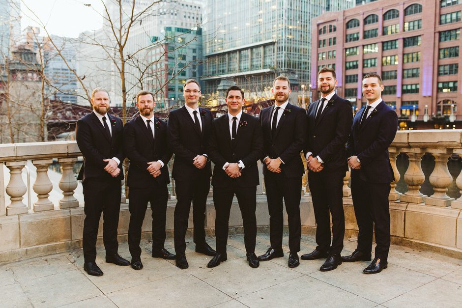 Brad and his groomsmen wore a black suit by Calvin Klein with Penguin gingham skinny ties. He knew he wanted something classic, but also something versatile that he and the guys could wear again one day. They wore State and Liberty dress shirts, which was perfect because it ended up being 90 degrees and humid that day. He surprised the groomsmen with custom embroidered dress socks with their initials the night before the big day.