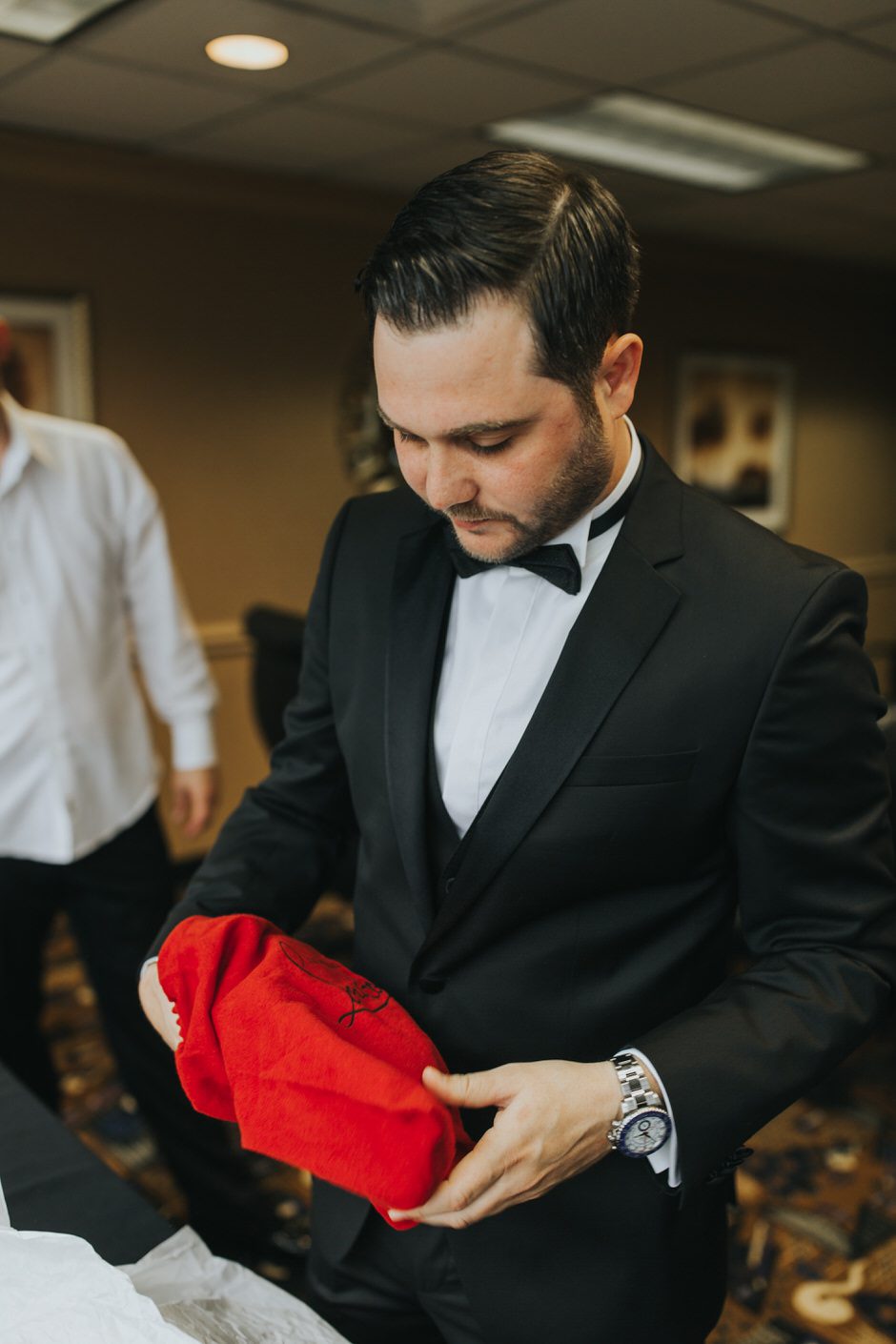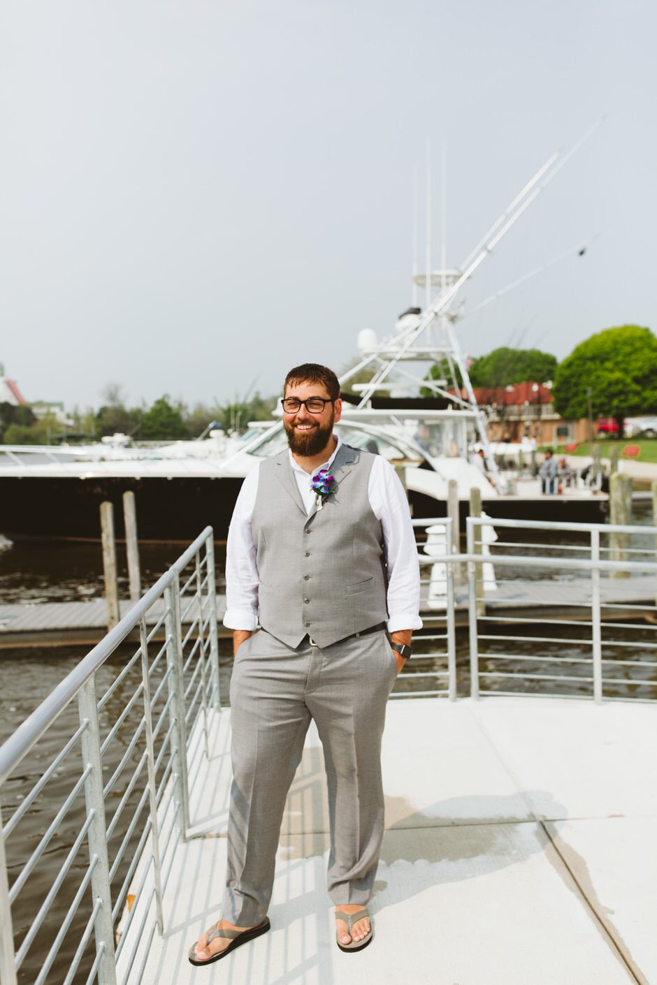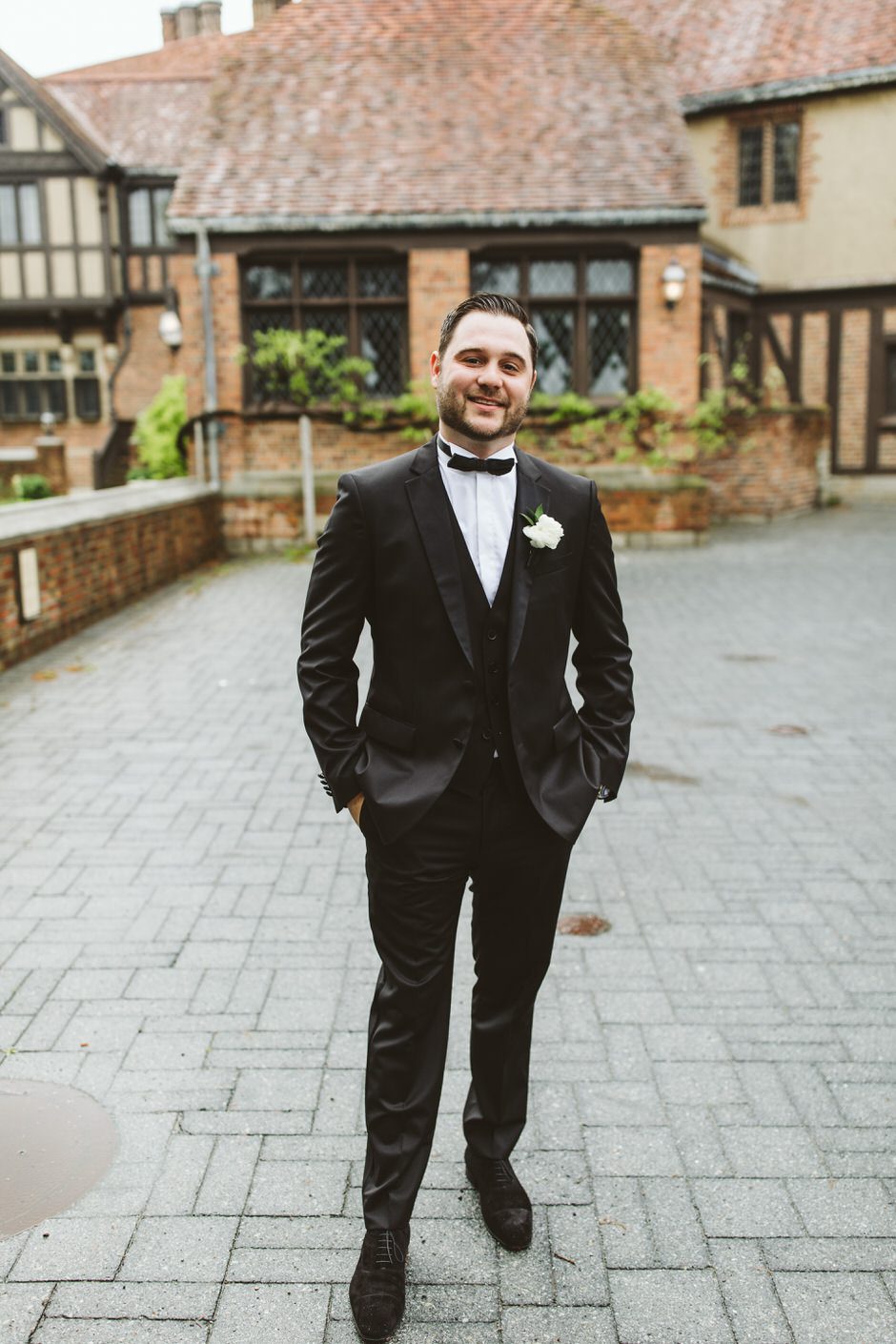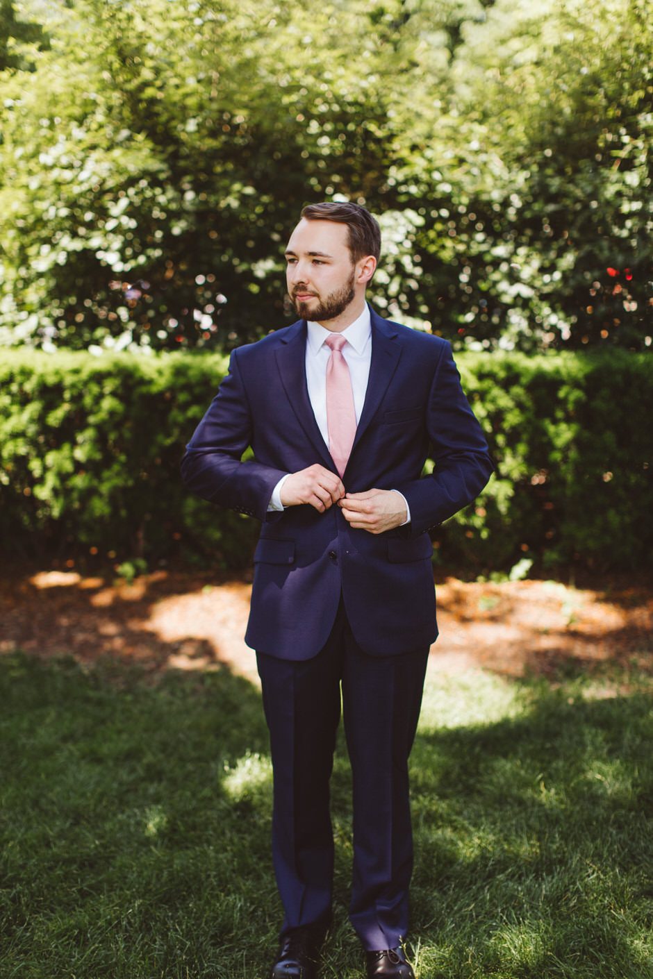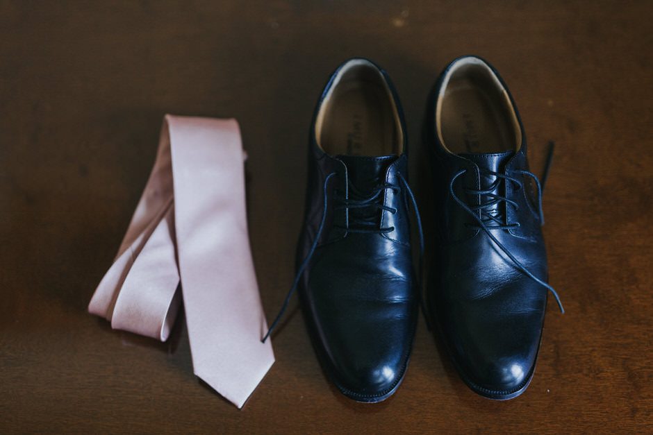 Brad and his groomsmen wore a black suit by Calvin Klein with Penguin gingham skinny ties. He knew he wanted something classic, but also something versatile that he and the guys could wear again one day. They wore State and Liberty dress shirts, which was perfect because it ended up being 90 degrees and humid that day. He surprised the groomsmen with custom embroidered dress socks with their initials the night before the big day.