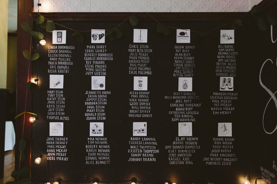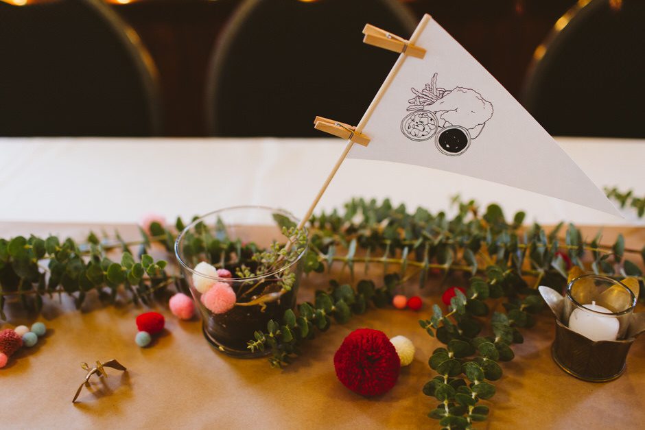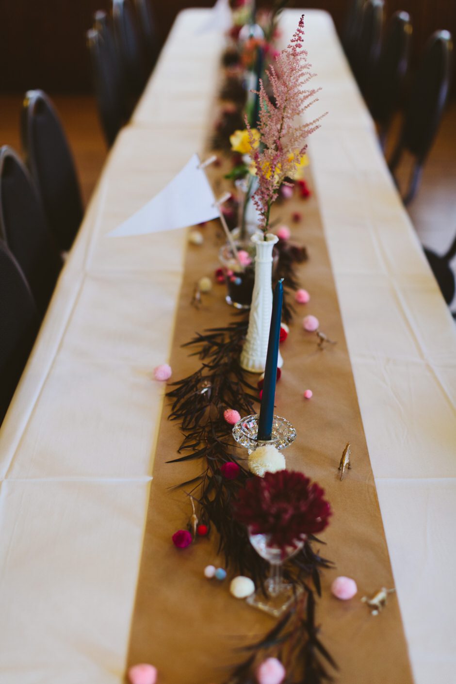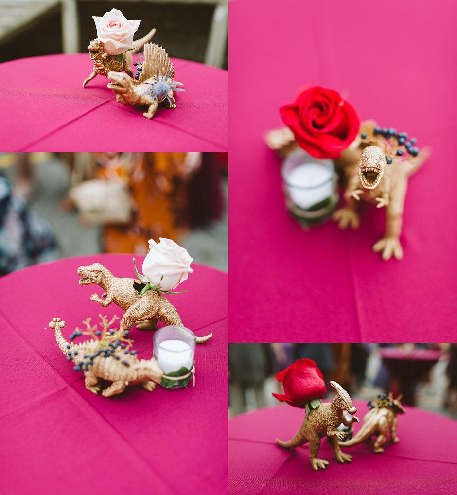 Brad named our theme “dinosaur and whimsy” – ha! We knew we wanted things to be quirky, personal, and fun throughout our day, and this included decor. So many people helped us make our day come together. My mom and aunt helped us thrift hundreds of mismatched vases and containers for our centerpieces, my maid of honor made our team bride and team groom buttons, our sister-in-law made us beautiful chalkboard signs, Brad’s best man drew all of our table illustrations and seating chart signs, Brad’s dad built the trellis for the ceremony, and I personally painted about 500 plastic dinosaurs with gold spray paint.