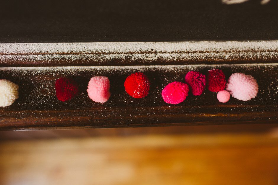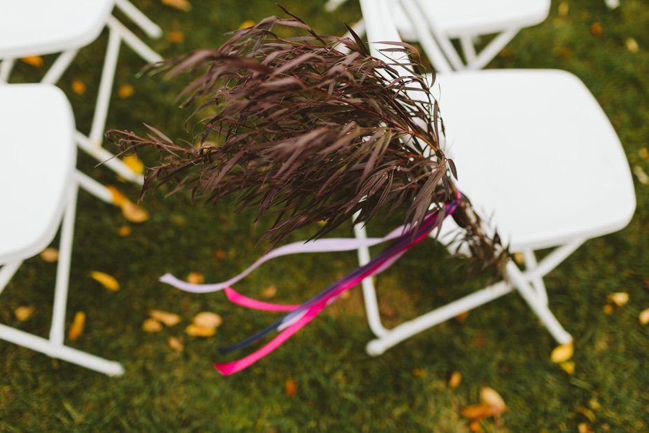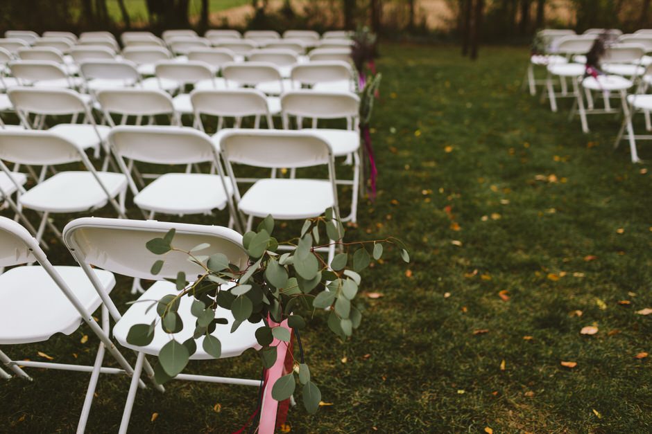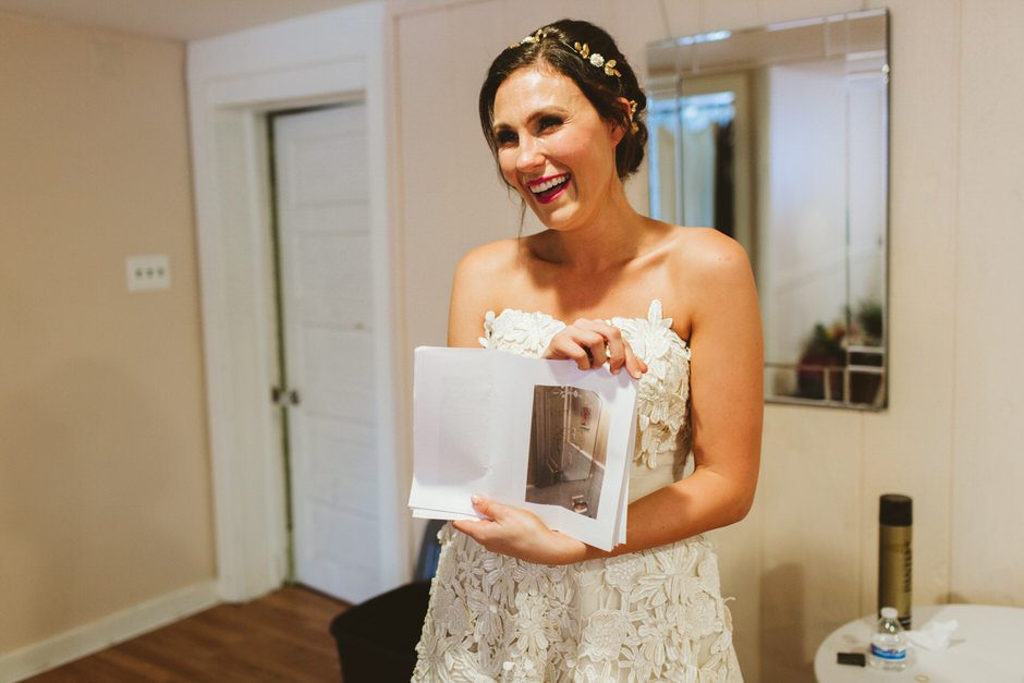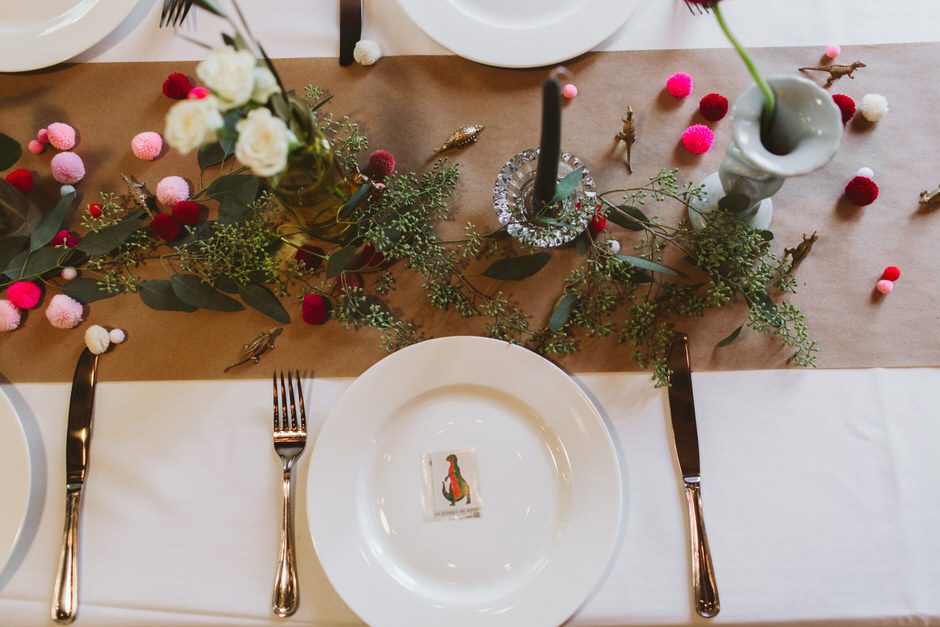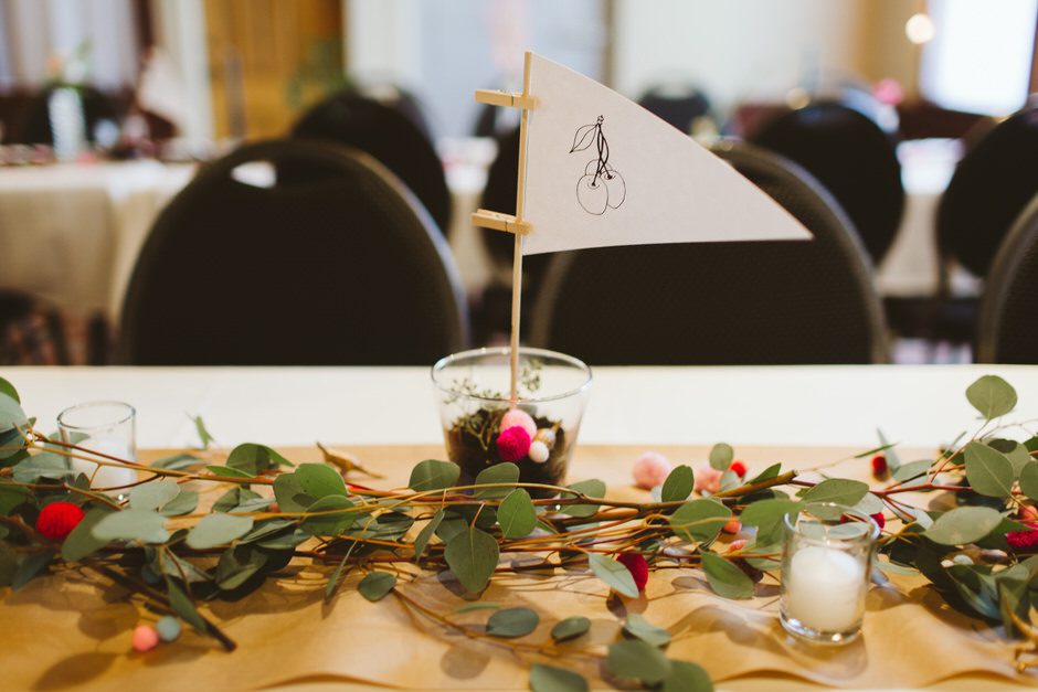Brad named our theme “dinosaur and whimsy” – ha! We knew we wanted things to be quirky, personal, and fun throughout our day, and this included decor. So many people helped us make our day come together. My mom and aunt helped us thrift hundreds of mismatched vases and containers for our centerpieces, my maid of honor made our team bride and team groom buttons, our sister-in-law made us beautiful chalkboard signs, Brad’s best man drew all of our table illustrations and seating chart signs, Brad’s dad built the trellis for the ceremony, and I personally painted about 500 plastic dinosaurs with gold spray paint.