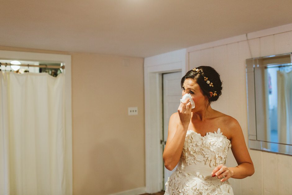 My parents visited Nashville soon after our engagement, and my mom was so excited that we made an appointment at a consignment dress store just to see what was available and what I liked. I found the PERFECT dress right away – a perfectly quirky yet romantic Robert Bullock dress with a full chiffon skirt and lace flowers that almost float when I walked. Way more traditional than I thought I would go with, but I couldn’t have loved it more!