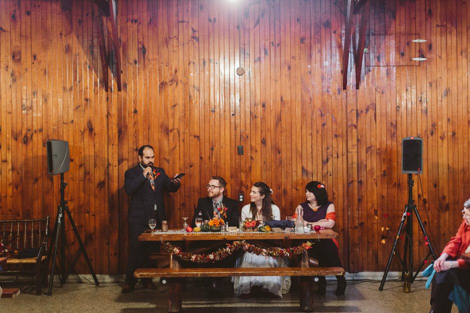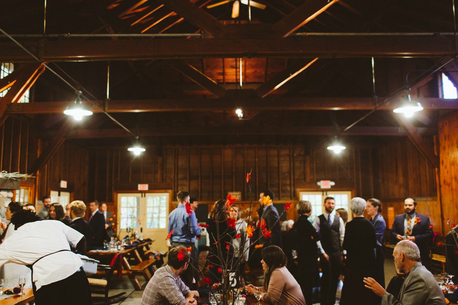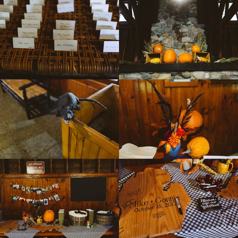 With such a great venue, we decided to just go with the rustic look and embraced a classic fall theme. Connie made most of the decorations herself, including the centerpieces, table runners, signage, and floral decorations. It was really fun to come up with creative, cost-effective solutions for the decor. For the centerpieces, we collected branches, then Connie glued fake leaves onto them and arranged them in festive orange vases from the dollar store. For the table runners, she took a class to learn how to use a sewing machine, then bought fabric with a great coupon and sewed all the table runners and tablecloths. All the signs and table numbers were hand-painted and made from scrap wood.