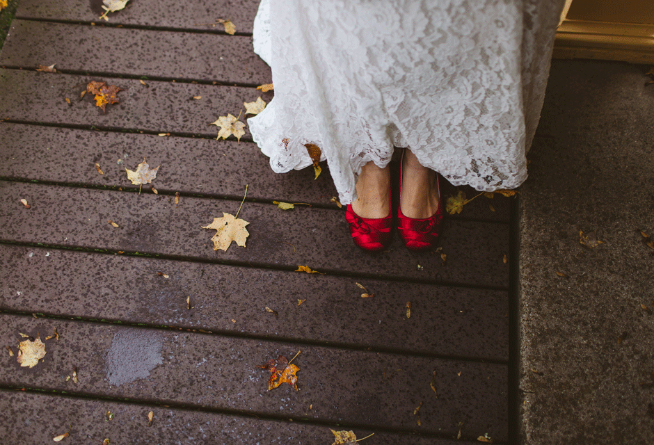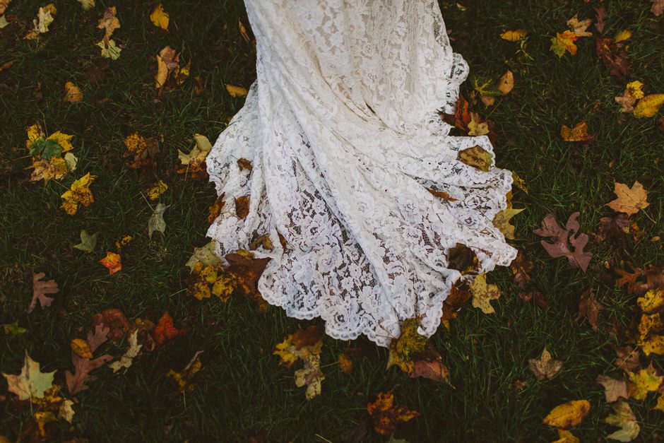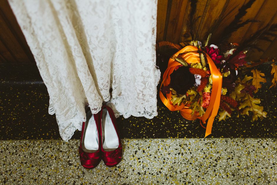 It only took one day to find my dress! My mom, sister, and I went to several bridal shops and department stores in my hometown in Ohio. I’m rather practical and didn’t want to spend a lot of money on a dress I’d only wear for a few hours, but I also wanted something that reflected my love of all things vintage. We hit the jackpot at a small shop at the end of the day, and I bought the dress directly off the sale rack at a steal–I only had to have some minor alterations done later. I paired the dress with a pair of comfy, bright red heels I’ve owned for years. For my accessories, I wore a pearl necklace and pearl earrings that my grandmas each gave me when I graduated from college. I made my own bouquet out of fall leaves and an assortment of wood, silk, and dried flowers, and my sister made the clip for my hair.