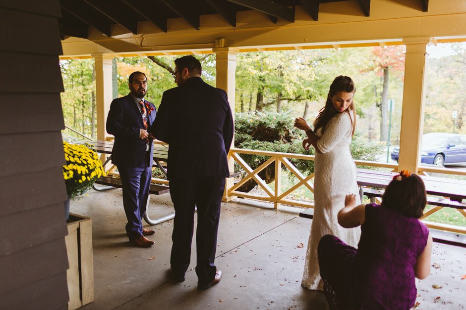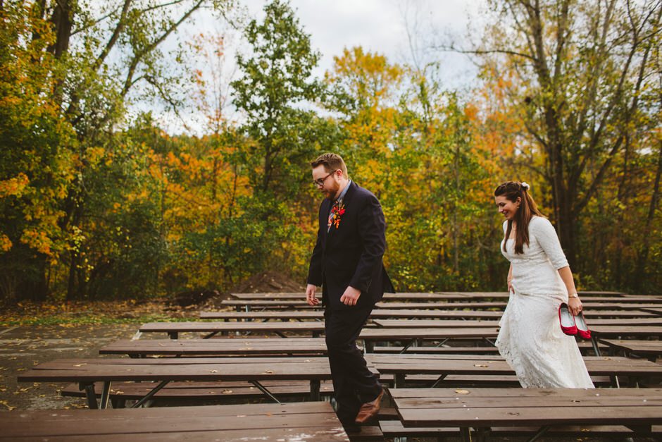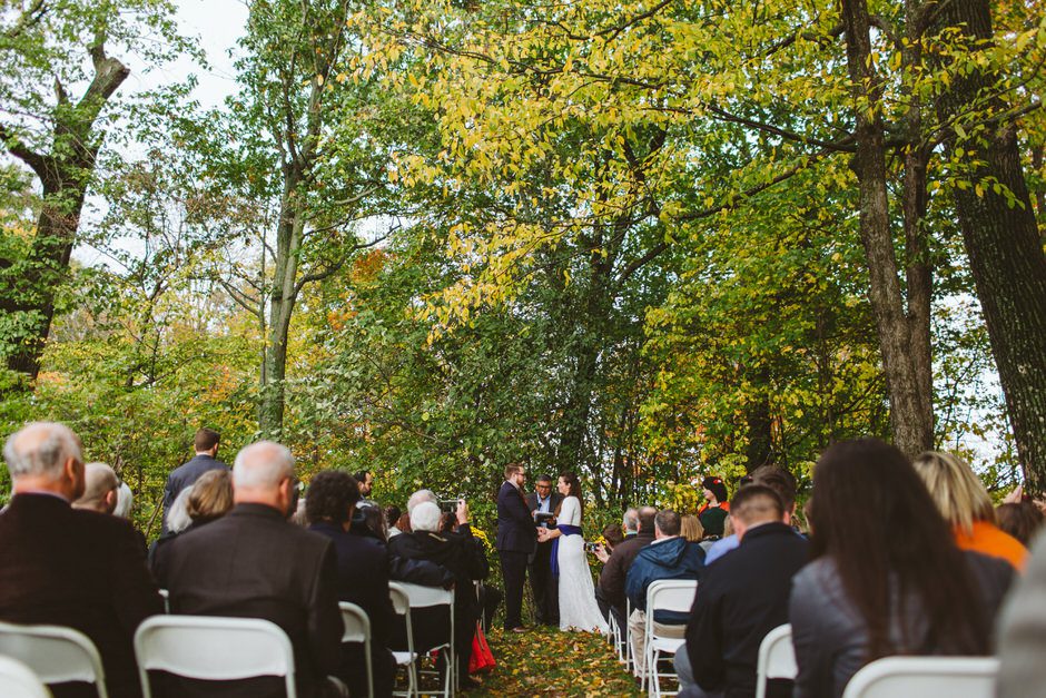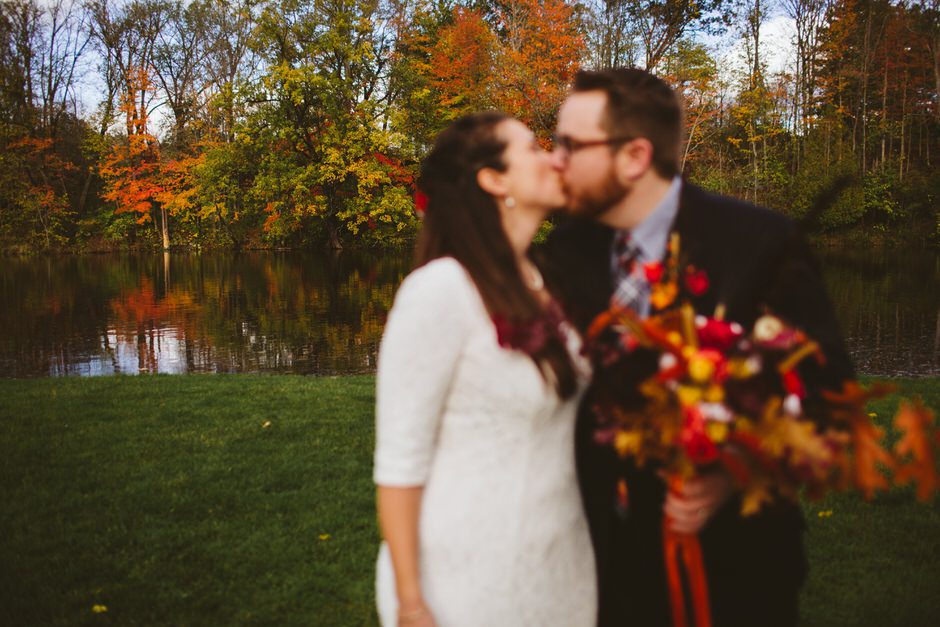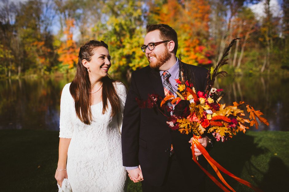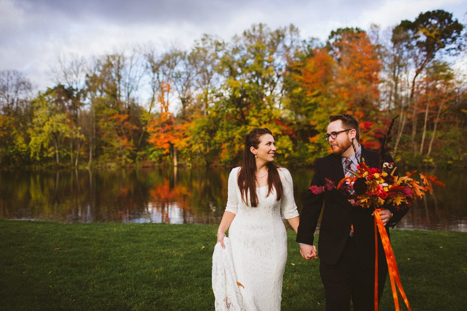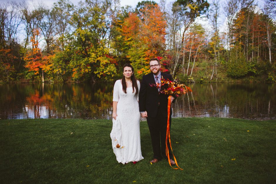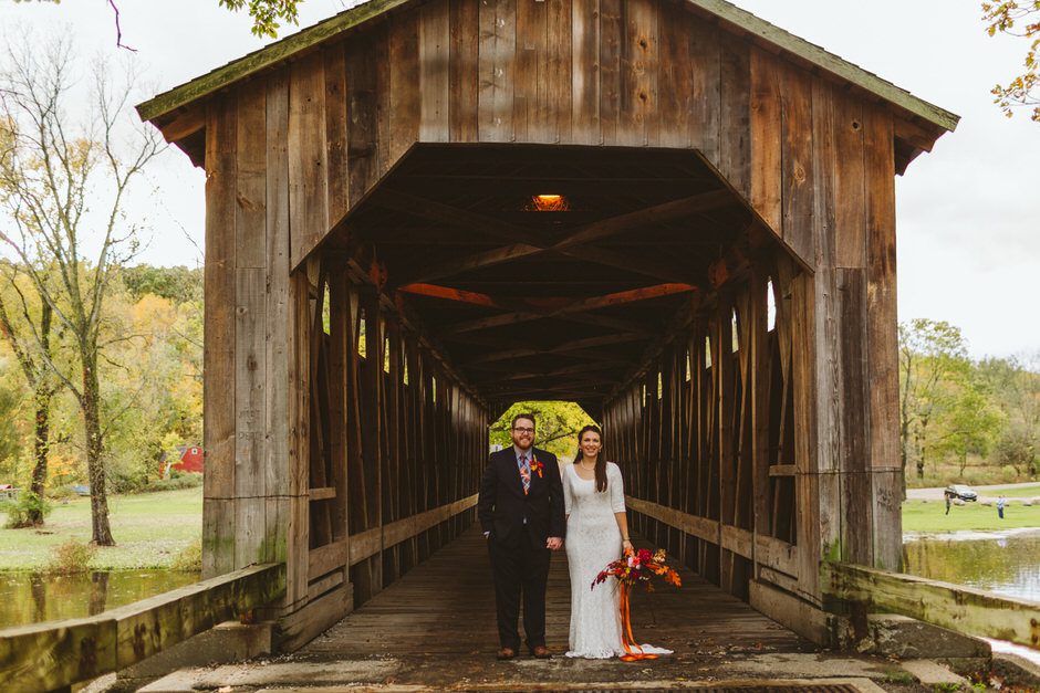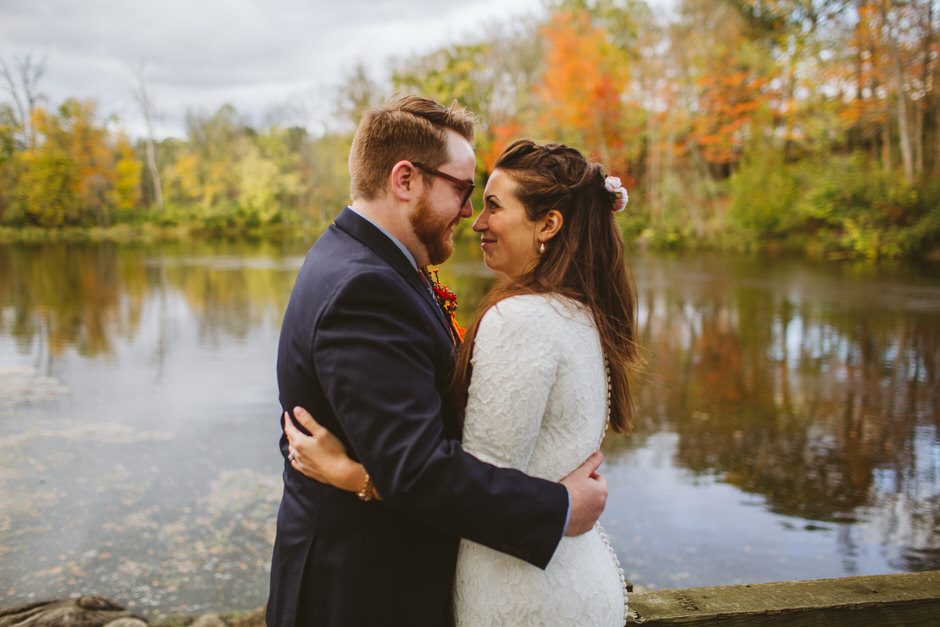 We actually found our venue by accident! We originally stopped by Fallasburg Park to check out the covered bridge, thinking that it might be a good location for the ceremony. After driving by, though, it was obvious there wasn’t enough space to accommodate all our guests. Disappointed, we drove over the bridge to head home–and immediately discovered the enclosed shelter house on the other side of the park. It was built in the 1930s and has a giant stone fireplace, cool vintage picnic tables, and a beautiful, forested view overlooking the river. We both love history, hiking, and camping, and with such a great rustic look, we knew it was perfect. We ended up getting married outside against the backdrop of fall colors, then moving inside the shelter house for the reception.