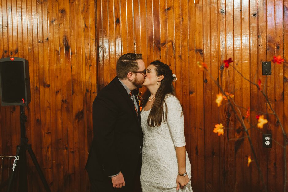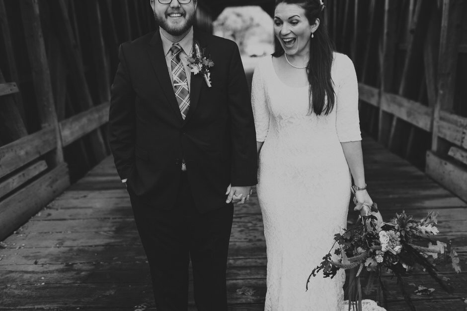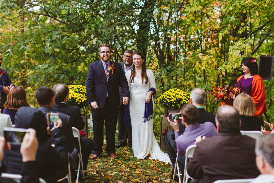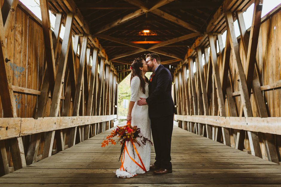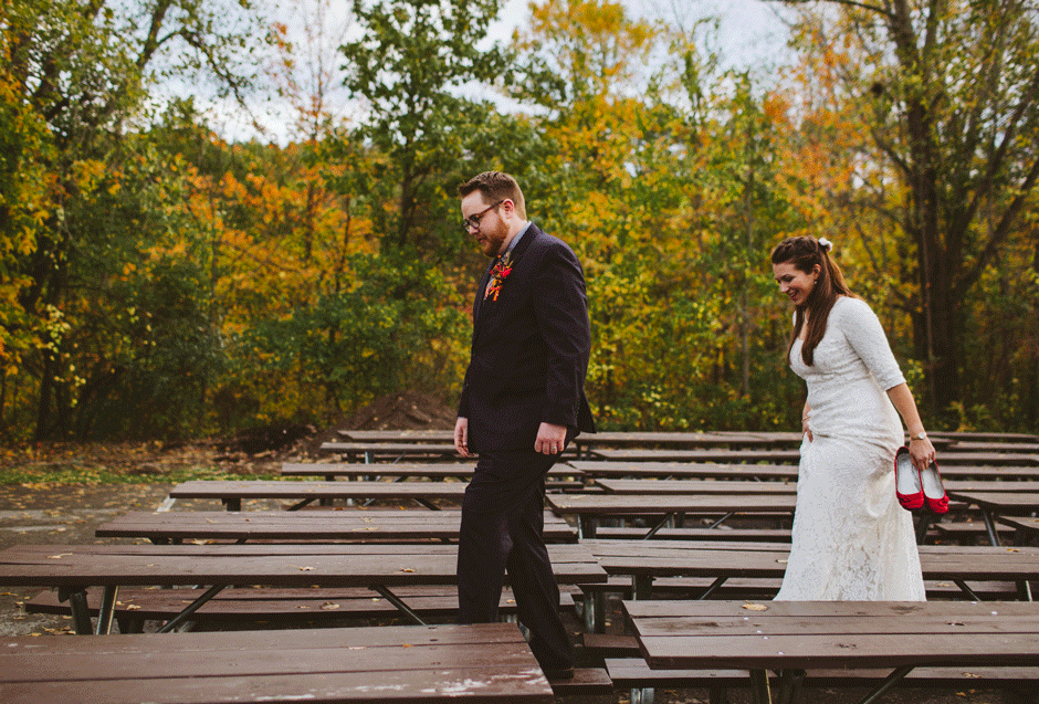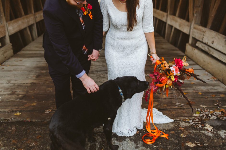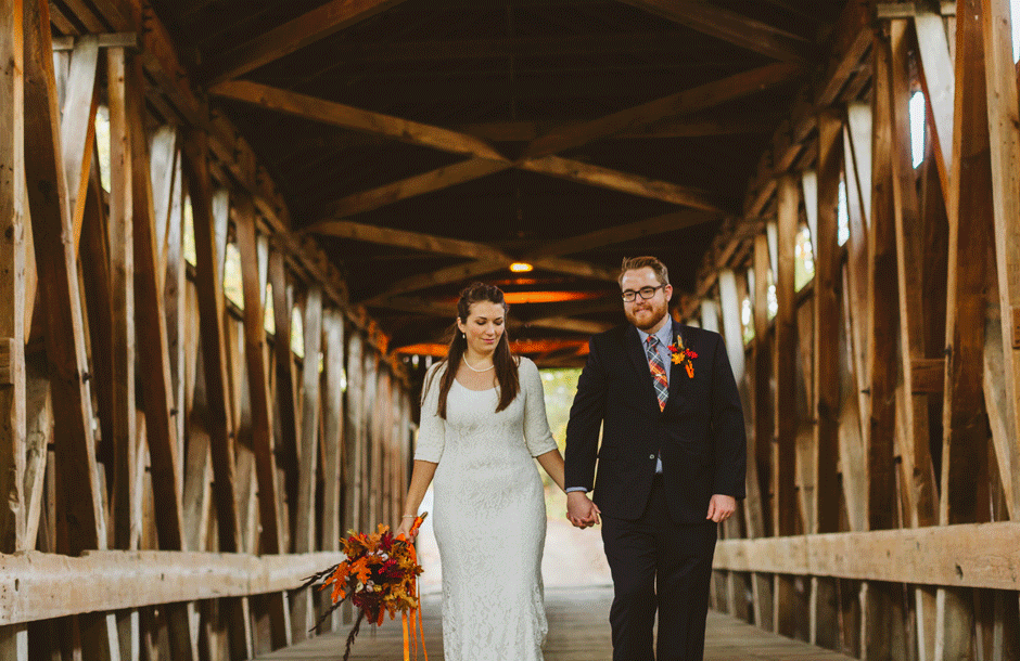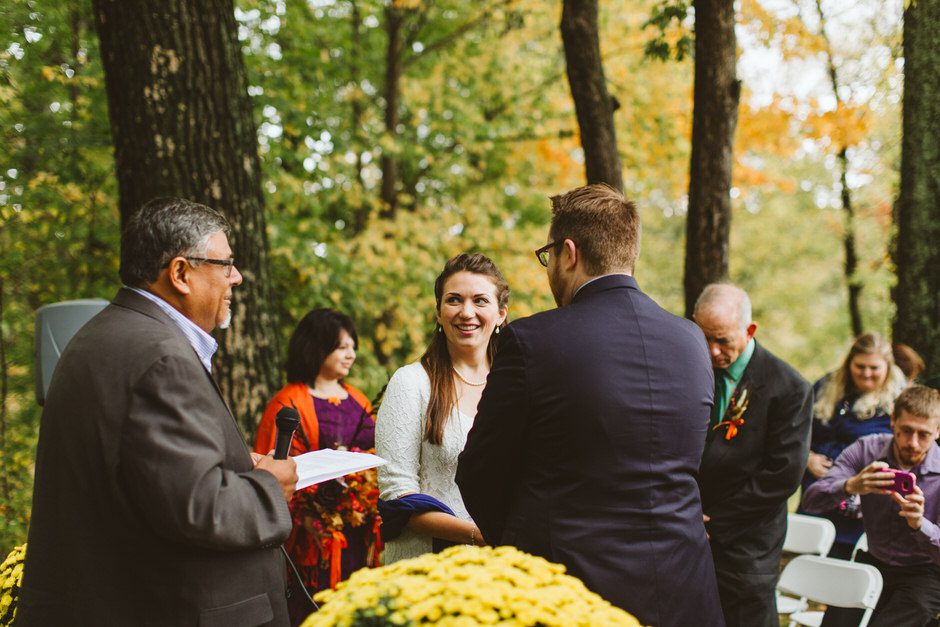 We actually found our venue by accident! We originally stopped by Fallasburg Park to check out the covered bridge, thinking that it might be a good location for the ceremony. After driving by, though, it was obvious there wasn’t enough space to accommodate all our guests. Disappointed, we drove over the bridge to head home–and immediately discovered the enclosed shelter house on the other side of the park. It was built in the 1930s and has a giant stone fireplace, cool vintage picnic tables, and a beautiful, forested view overlooking the river. We both love history, hiking, and camping, and with such a great rustic look, we knew it was perfect. We ended up getting married outside against the backdrop of fall colors, then moving inside the shelter house for the reception.