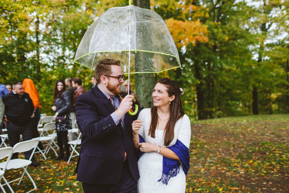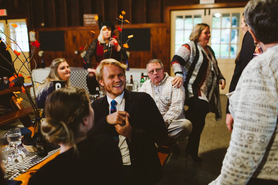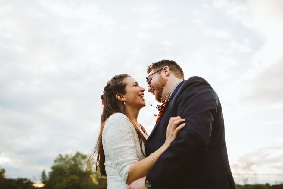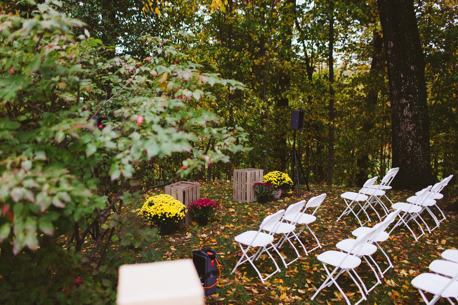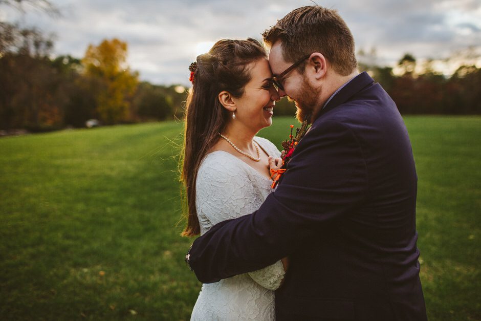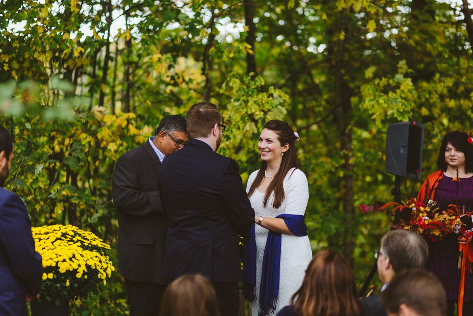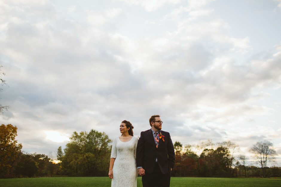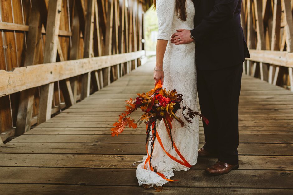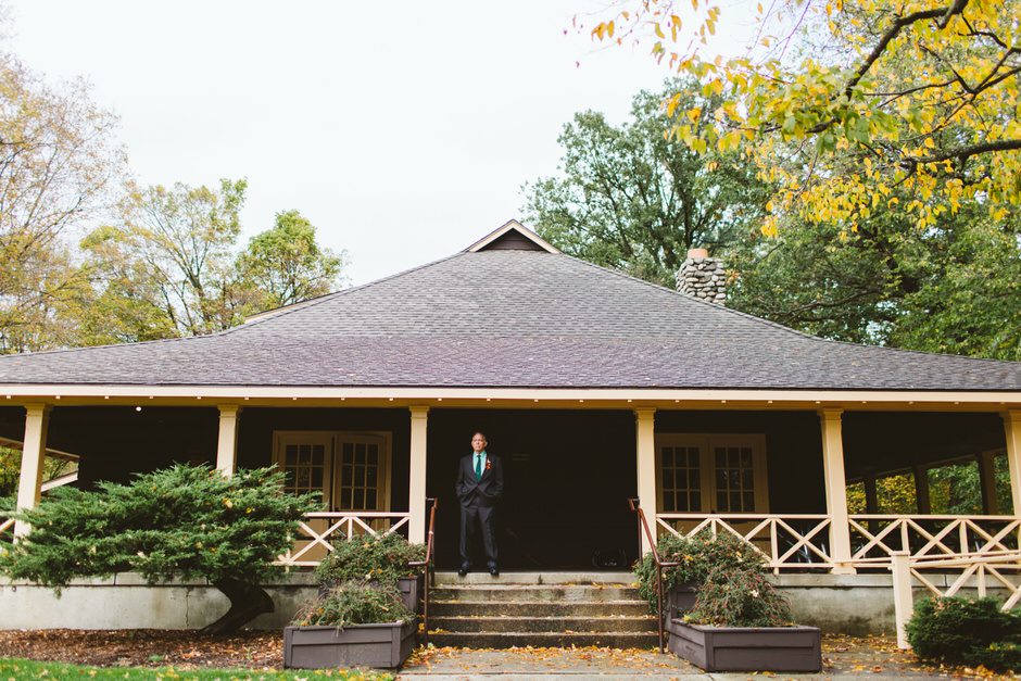 We actually found our venue by accident! We originally stopped by Fallasburg Park to check out the covered bridge, thinking that it might be a good location for the ceremony. After driving by, though, it was obvious there wasn’t enough space to accommodate all our guests. Disappointed, we drove over the bridge to head home–and immediately discovered the enclosed shelter house on the other side of the park. It was built in the 1930s and has a giant stone fireplace, cool vintage picnic tables, and a beautiful, forested view overlooking the river. We both love history, hiking, and camping, and with such a great rustic look, we knew it was perfect. We ended up getting married outside against the backdrop of fall colors, then moving inside the shelter house for the reception.