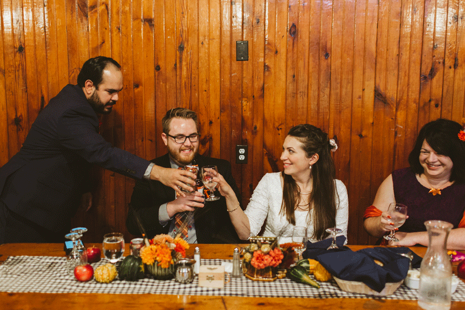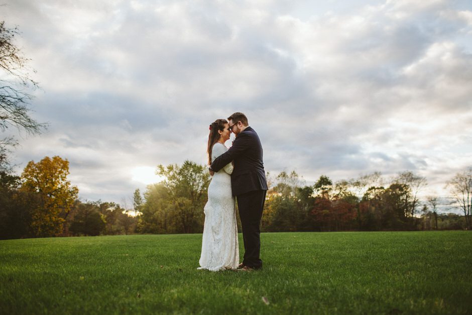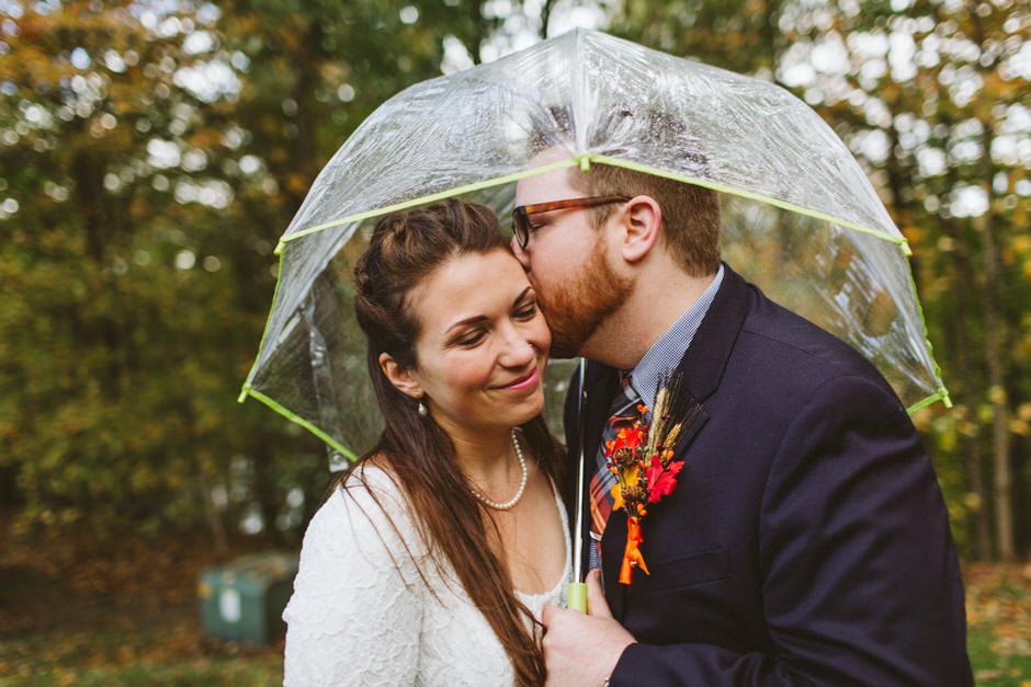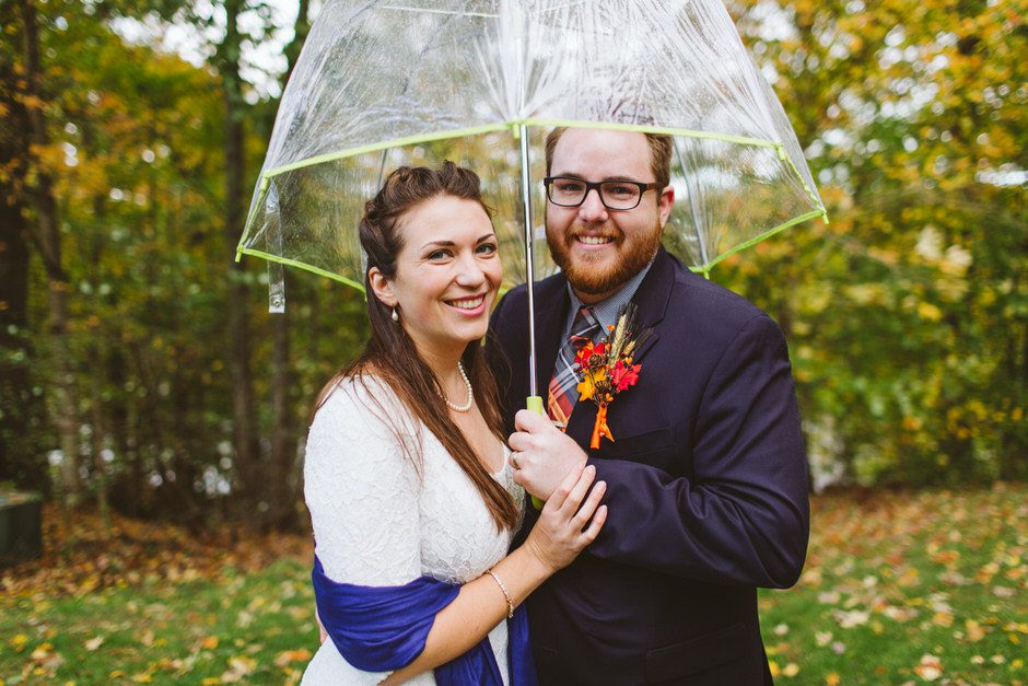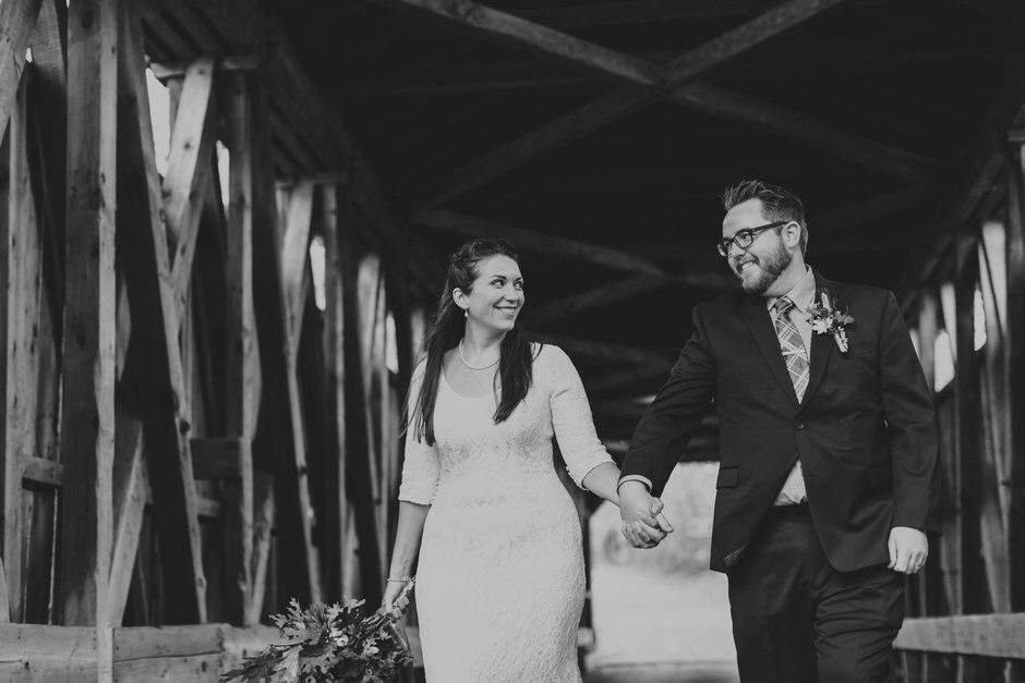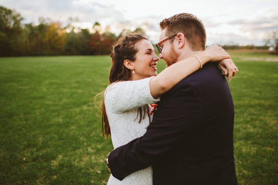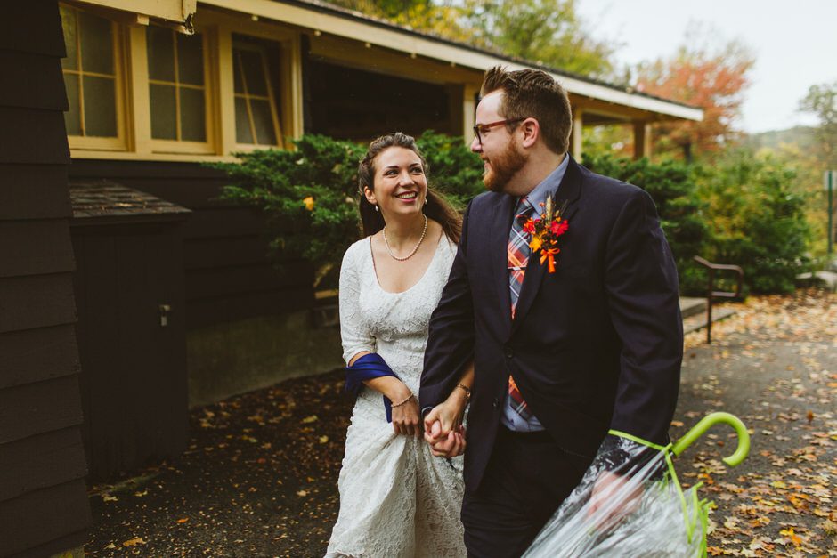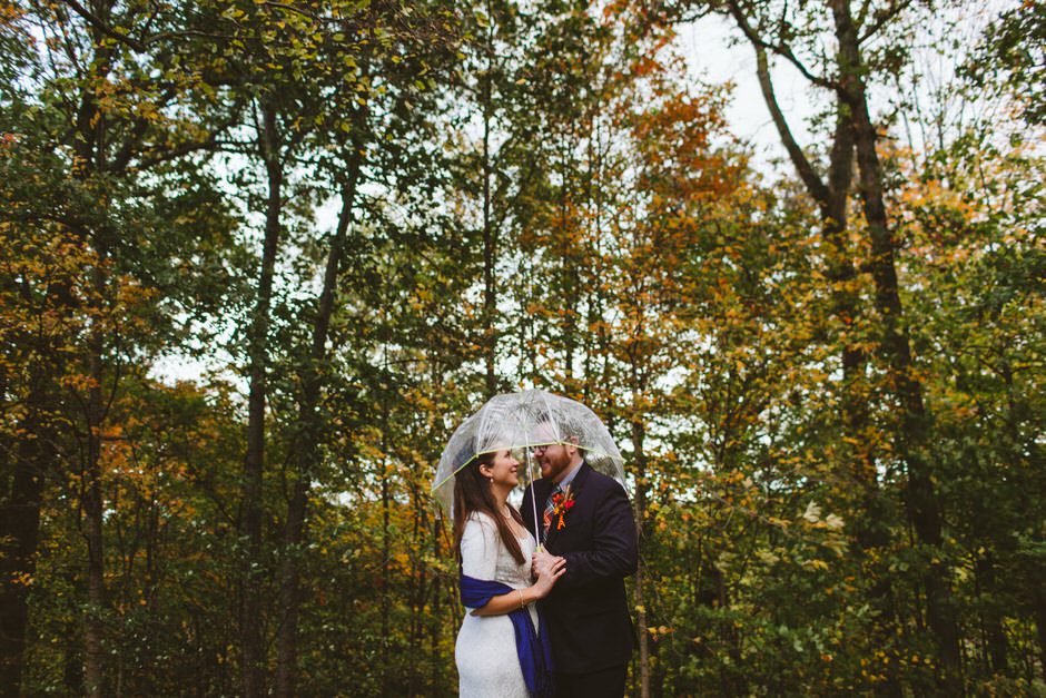 We actually found our venue by accident! We originally stopped by Fallasburg Park to check out the covered bridge, thinking that it might be a good location for the ceremony. After driving by, though, it was obvious there wasn’t enough space to accommodate all our guests. Disappointed, we drove over the bridge to head home–and immediately discovered the enclosed shelter house on the other side of the park. It was built in the 1930s and has a giant stone fireplace, cool vintage picnic tables, and a beautiful, forested view overlooking the river. We both love history, hiking, and camping, and with such a great rustic look, we knew it was perfect. We ended up getting married outside against the backdrop of fall colors, then moving inside the shelter house for the reception.