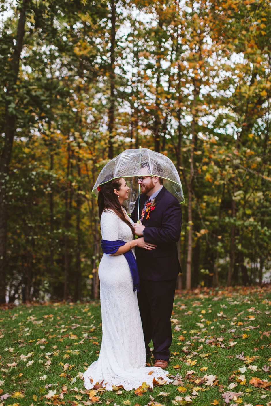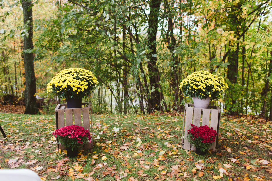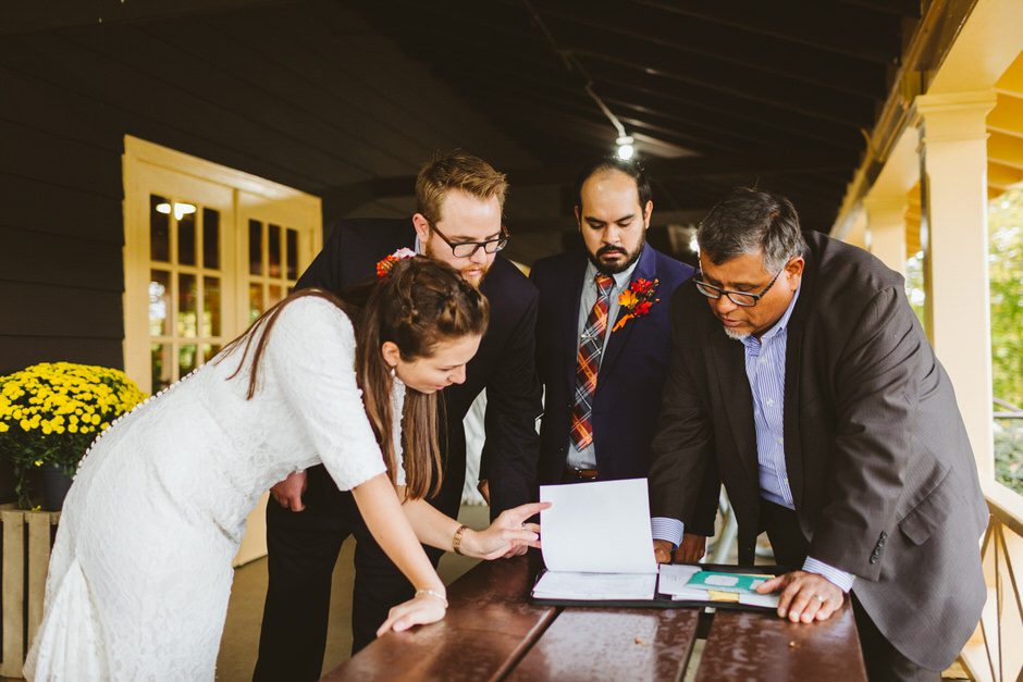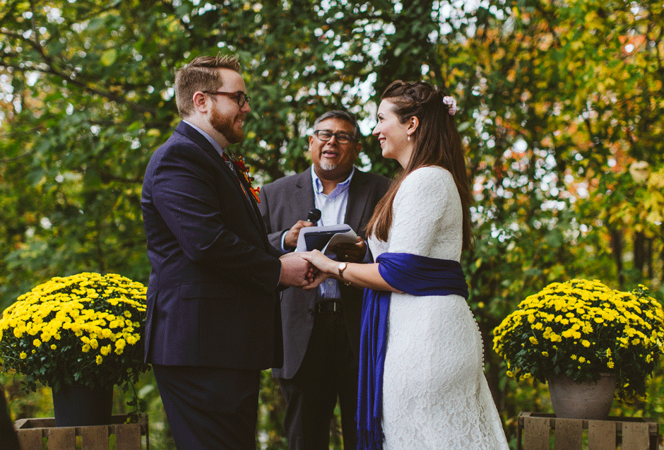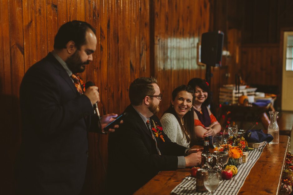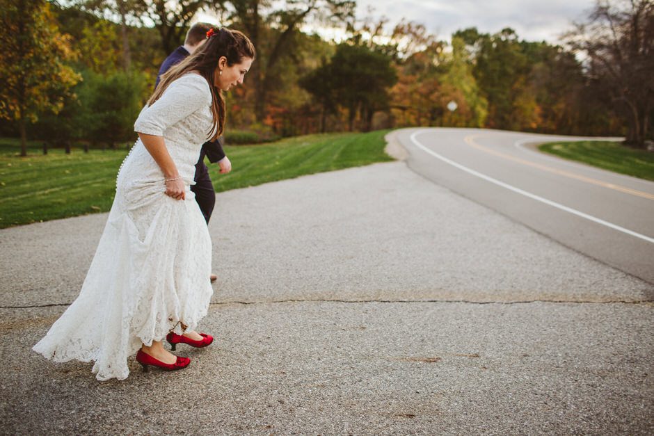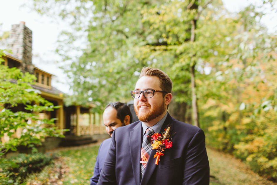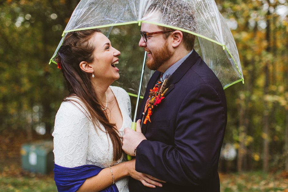 We actually found our venue by accident! We originally stopped by Fallasburg Park to check out the covered bridge, thinking that it might be a good location for the ceremony. After driving by, though, it was obvious there wasn’t enough space to accommodate all our guests. Disappointed, we drove over the bridge to head home–and immediately discovered the enclosed shelter house on the other side of the park. It was built in the 1930s and has a giant stone fireplace, cool vintage picnic tables, and a beautiful, forested view overlooking the river. We both love history, hiking, and camping, and with such a great rustic look, we knew it was perfect. We ended up getting married outside against the backdrop of fall colors, then moving inside the shelter house for the reception.
