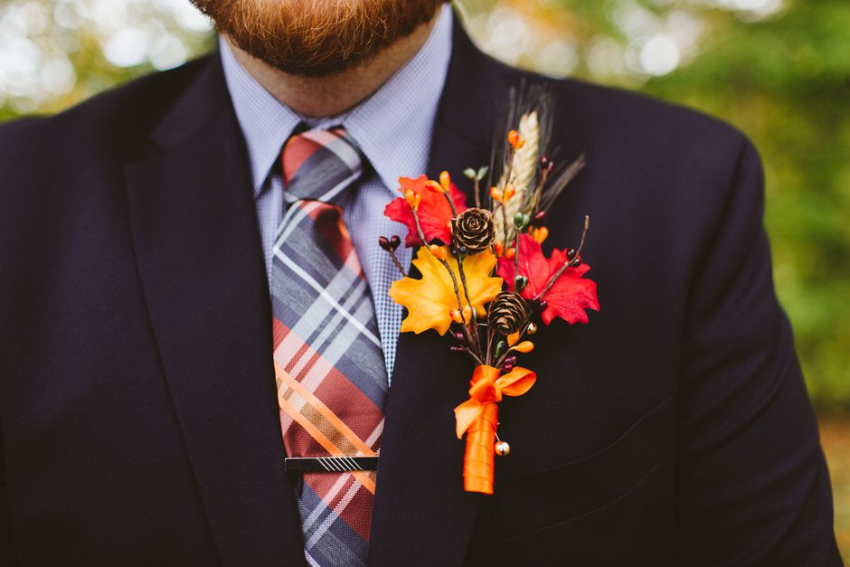 Finding my suit was pretty straightforward. We went with a navy suit since it paired perfectly with our decorations. I’m also known for wearing checkered shirts so finding one to wear at the wedding was a must. We topped it off with matching orange plaid ties for me and my best man. The ties were even on clearance! Connie made my boutonniere herself.