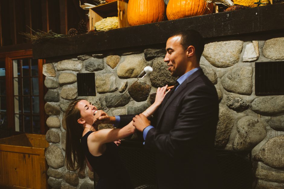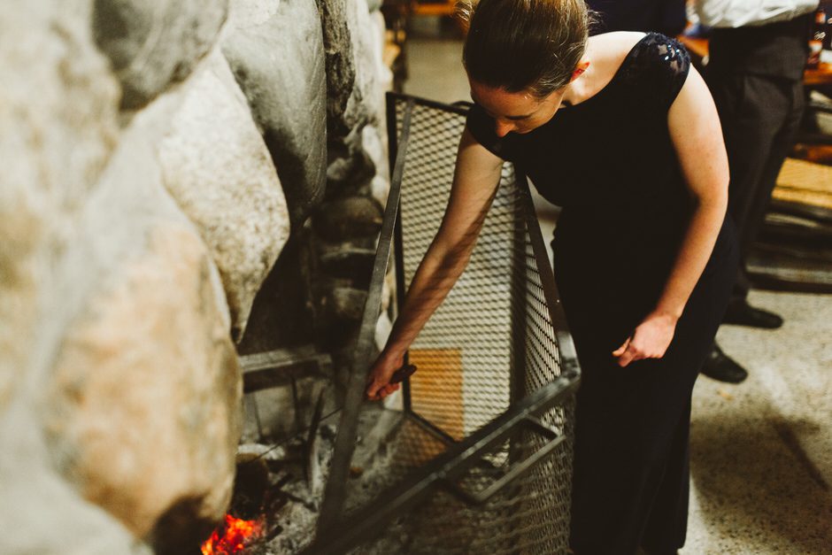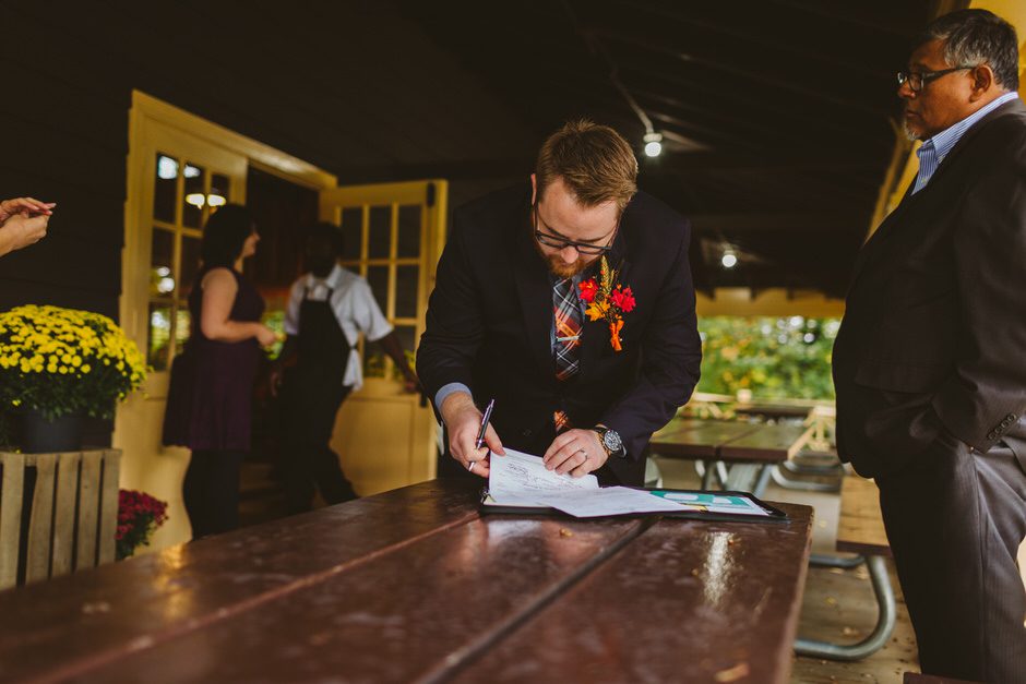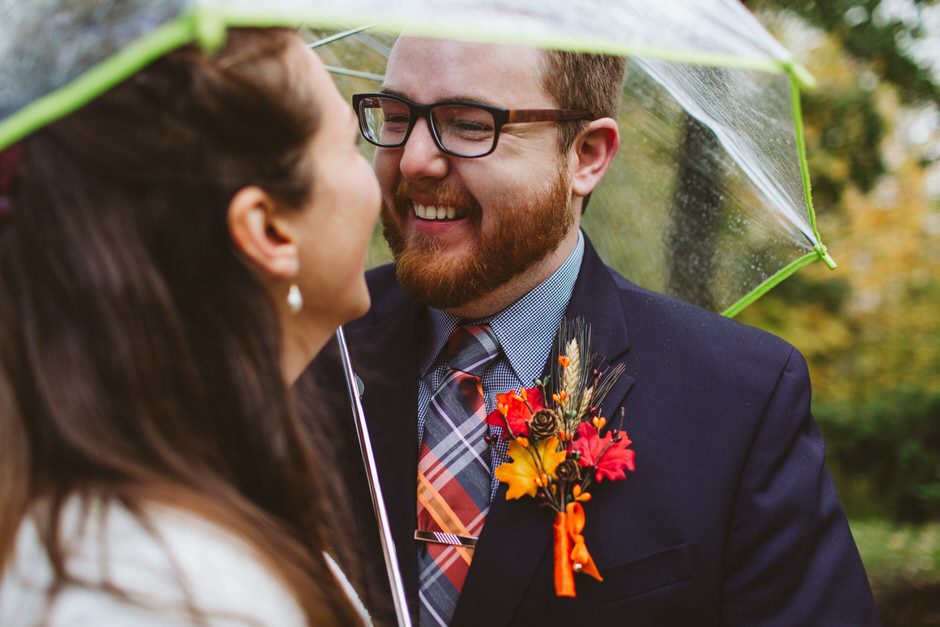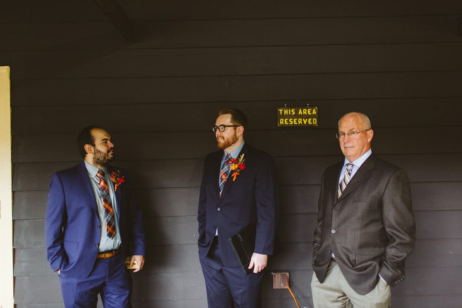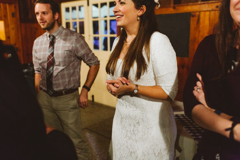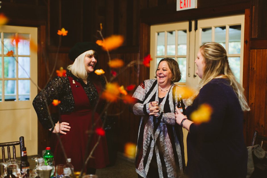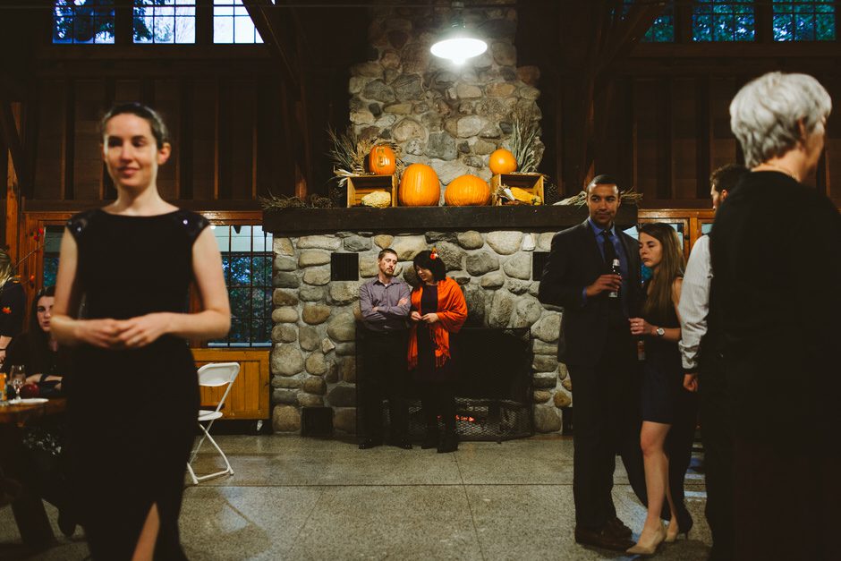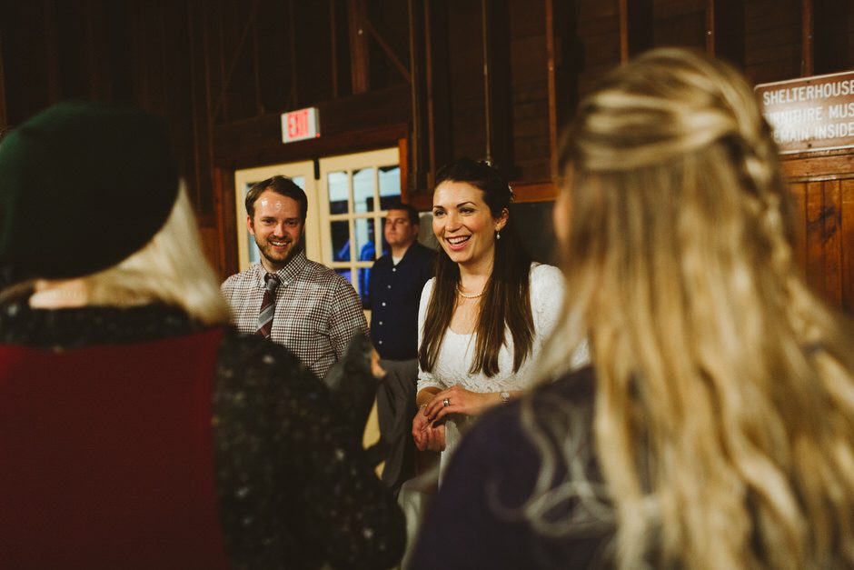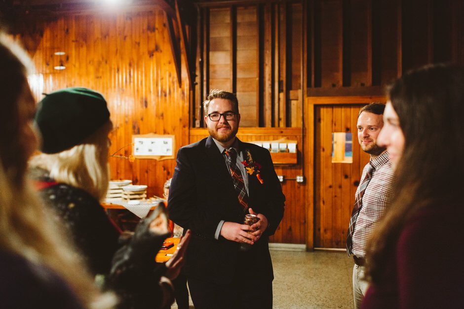 Although the rain that had been threatening us all day held off for the ceremony, we did have one major hitch in our plans: the person who we had scheduled to marry us was over an hour late! Fortunately, we were able to invite our guests into the reception area early so they could stay warm and enjoy popcorn and board games while we waited.