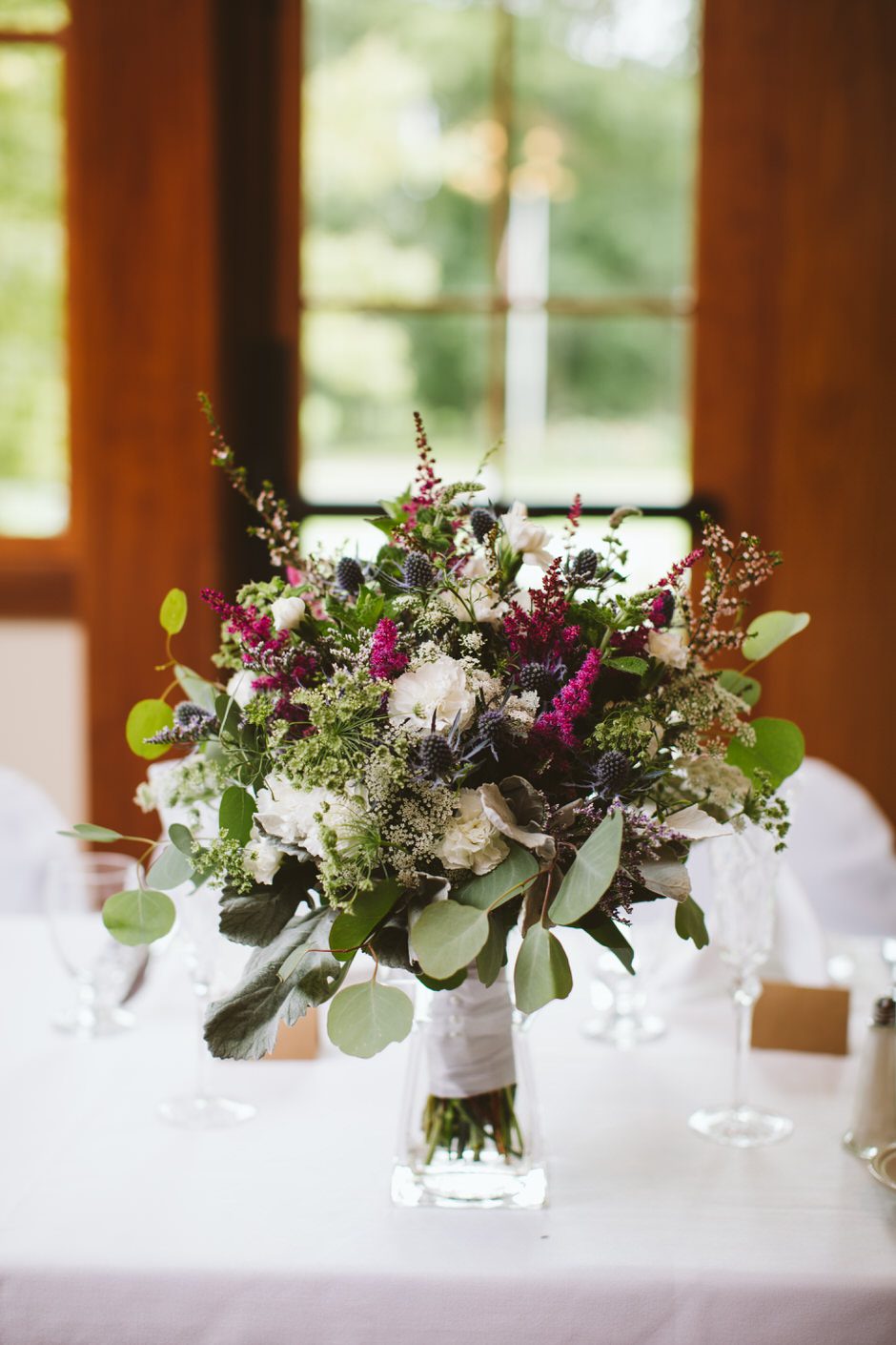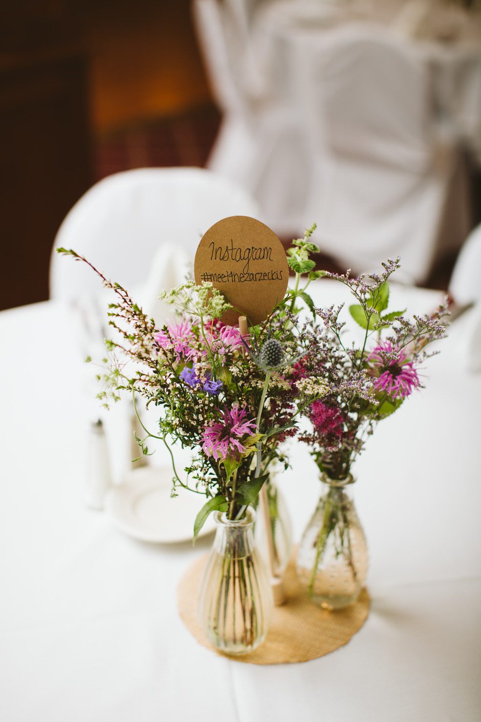 Simple, all IÂ wanted was simple. The flowers were the main decoration in the reception room and a few small details like some signs and amazing escort cards that my best friend/maid of honor made (Elise) My mistress of ceremony, maid of honor, grandmother and mother all helped get everything in place the day before the wedding at the golf club.