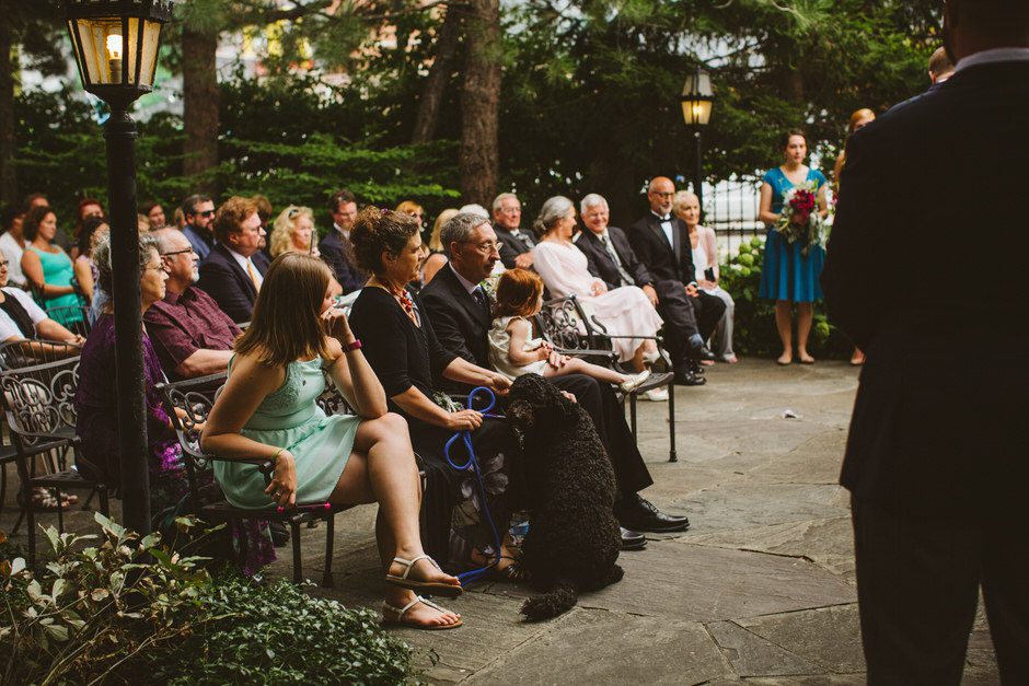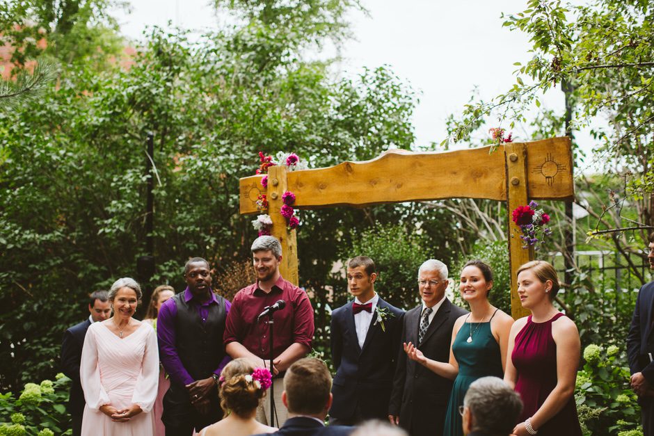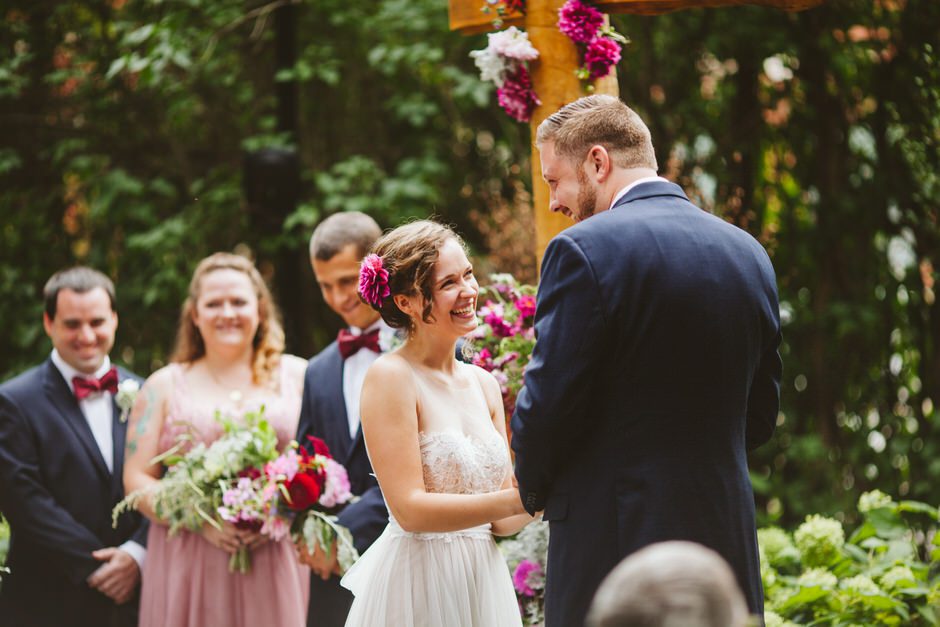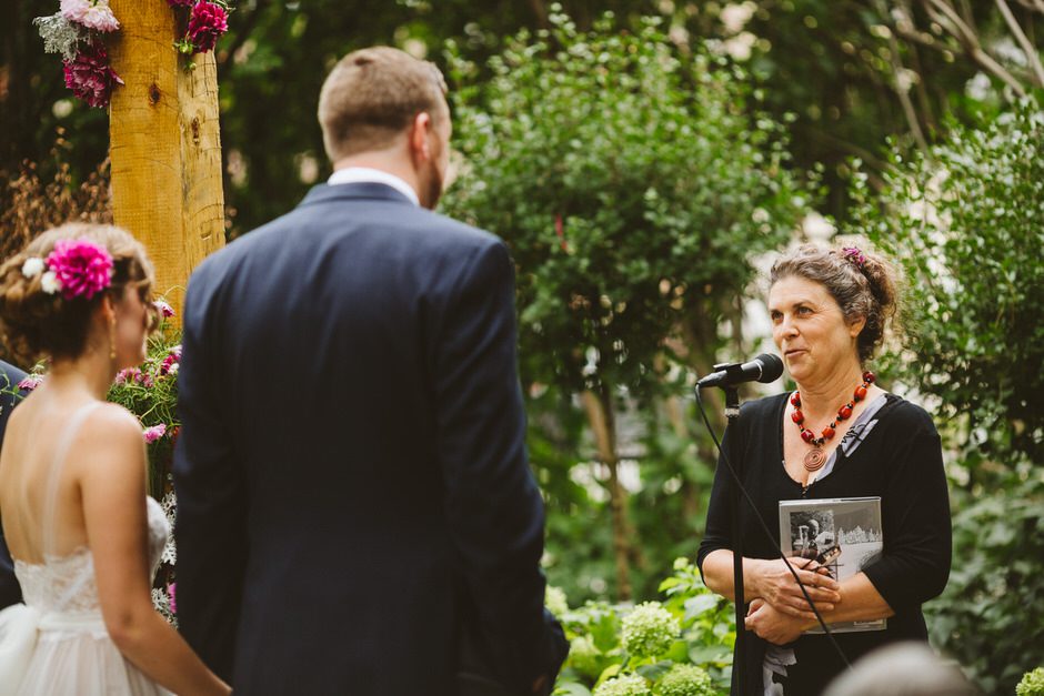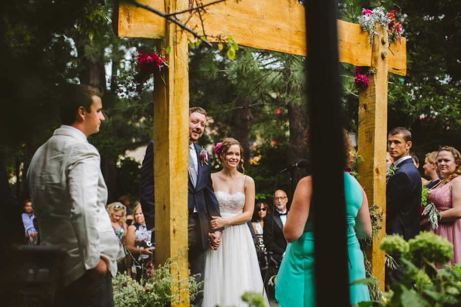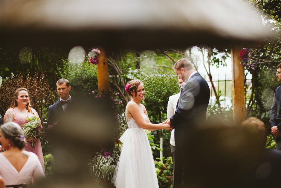 We spent a lot of time thinking about how we wanted our ceremony to be. Neither of us is religious, and we both tend to balk at tradition. We ended up settling on the idea of having our nearest and dearest fulfill the role of ‘officiant’ and marry us as a group. We decided that the only reason we were having a wedding, rather than eloping privately, was because we wanted to share this experience with our loved ones and in this spirit, we wanted to make sure to include everyone as much as possible in the ceremony itself. Our dear friend Matt served in the role of Master of Ceremonies and did such a wonderful job providing solemnity, meaning, and humor.