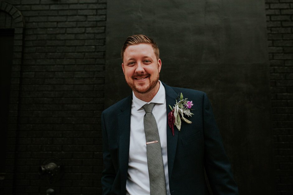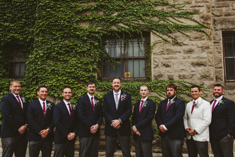The suits were purchased from Men’s Wearhouse. It was important to me (Calder) that the groomsmen didn’t waste $200 on a tux rental when just a bit more gave them something to keep. Despite Perie’s encouragement to be slightly more colorful in work clothing choices, Calder prefers simple, classic colors when dressing up. Luckily, this fit Perie’s vision of the wedding palette and a simple and modern but classic look of the navy jacket and grey pants complimented the style and feel of the wedding we envisioned. Perie loved the berry-colored groomsmen ties and my grey tie provided a nice contrast.