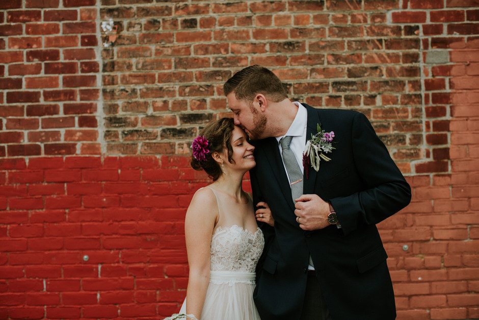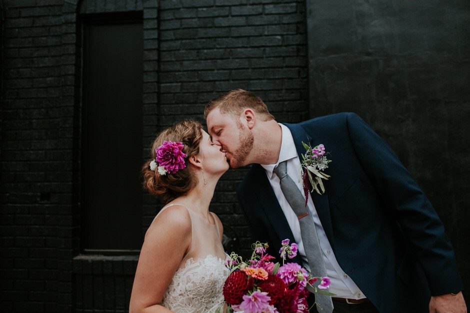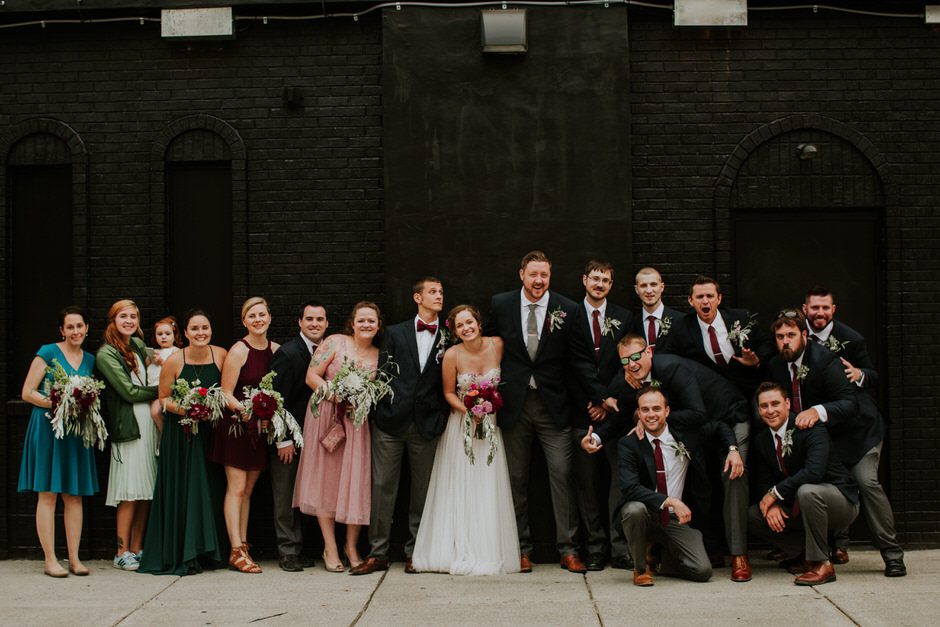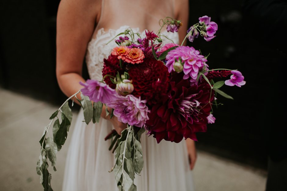 We didn’t really have a theme for our decorations, though I had a definite ‘vision’ in my mind going into the process. Our inspiration was built from the wedding color palette: berry, green, navy, and grey tones. Neither venue needed much decoration, as they each had personality and style on their own, so we mostly just focused on flowers/greenery and lighting. All of the flowers and greenery came from a local flower farm in the city (literally in a neighborhood in the city! You gotta love Detroit) called Fresh Cut Flower Farm. Sarah, the owner, did an amazing job creating the bouquets and boutonnieres, and also provided an astounding amount of loose florals and greenery for use in decorating. We did all the decorating and floral arranging ourselves, by which I mean my amazing family did all the hard, creative work while I merely provided a loose vision. My sisters created the table and escort cards (free hand calligraphy!), my mom made the beautiful, personalized cake topper (I baked and put together the cake myself. Proud of how it turned out, despite it’s homely appearance!), and Calder’s sister and mother made the cupcakes and gluten-free pie. I can’t emphasize enough how much of a collaborative, DIY affair our decor was.
