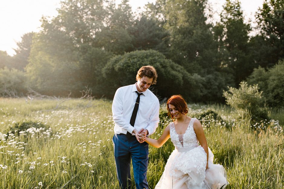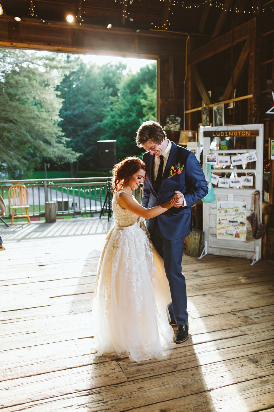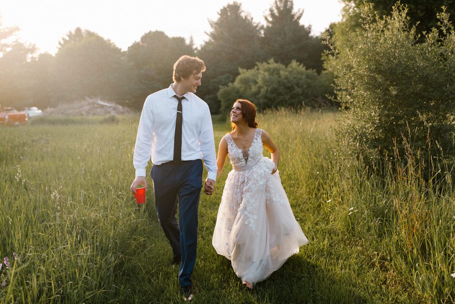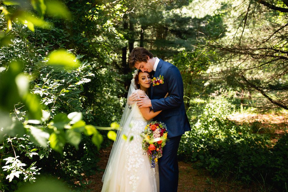 We got married at the Shagway Arts Barn in Ludington, Michigan. The barn is on a beautiful property that was the absolute perfect size for our wedding party (approx. 40 people – though, it certainly could’ve handled a few dozen more very comfortably). Nancy, the owner of the venue, was incredibly helpful and very easy to communicate with whenever we had any questions. The ceremony and dinner were held outside, and dancing during the reception was held inside the barn. There were plenty of great photo opportunities outside as the property is surrounded by lush forest and fields.