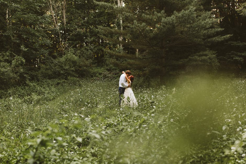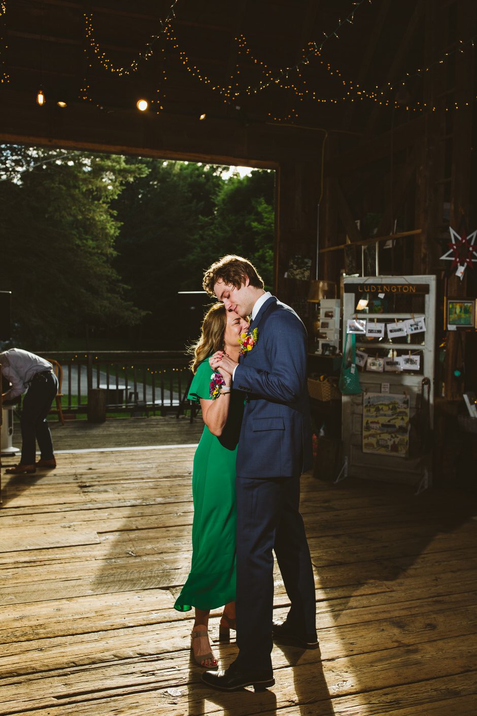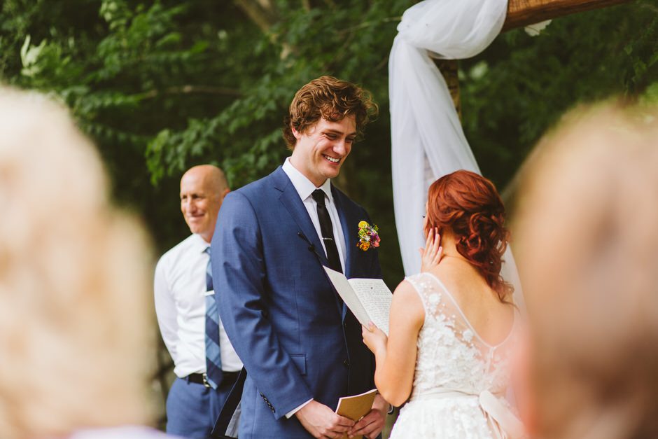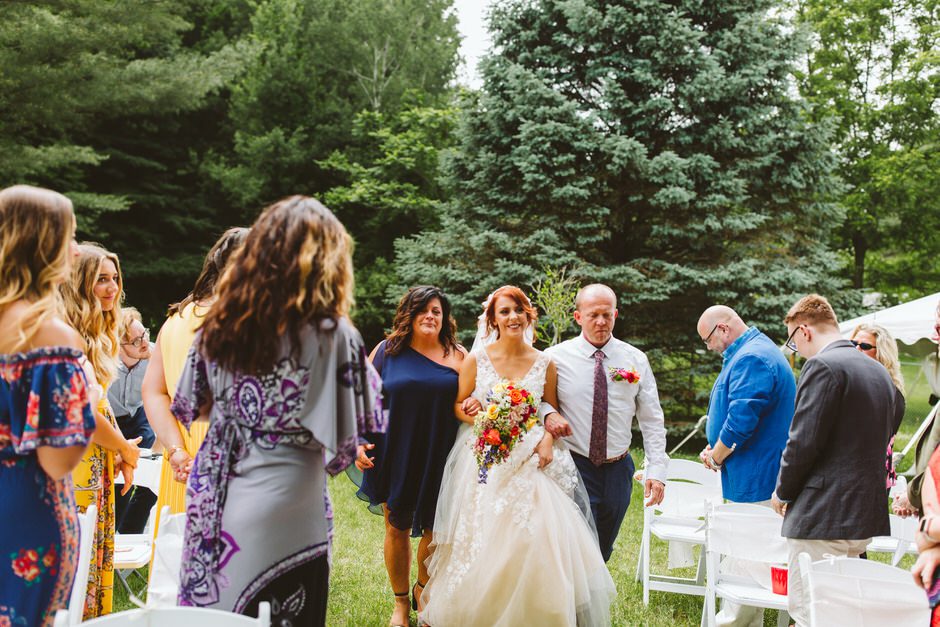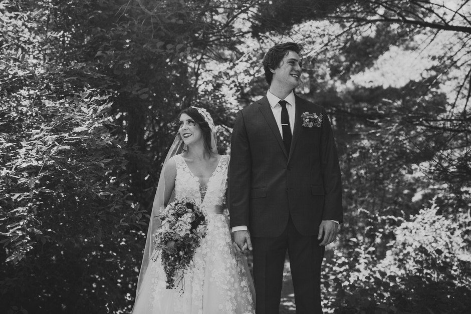 We got married at the Shagway Arts Barn in Ludington, Michigan. The barn is on a beautiful property that was the absolute perfect size for our wedding party (approx. 40 people – though, it certainly could’ve handled a few dozen more very comfortably). Nancy, the owner of the venue, was incredibly helpful and very easy to communicate with whenever we had any questions. The ceremony and dinner were held outside, and dancing during the reception was held inside the barn. There were plenty of great photo opportunities outside as the property is surrounded by lush forest and fields.