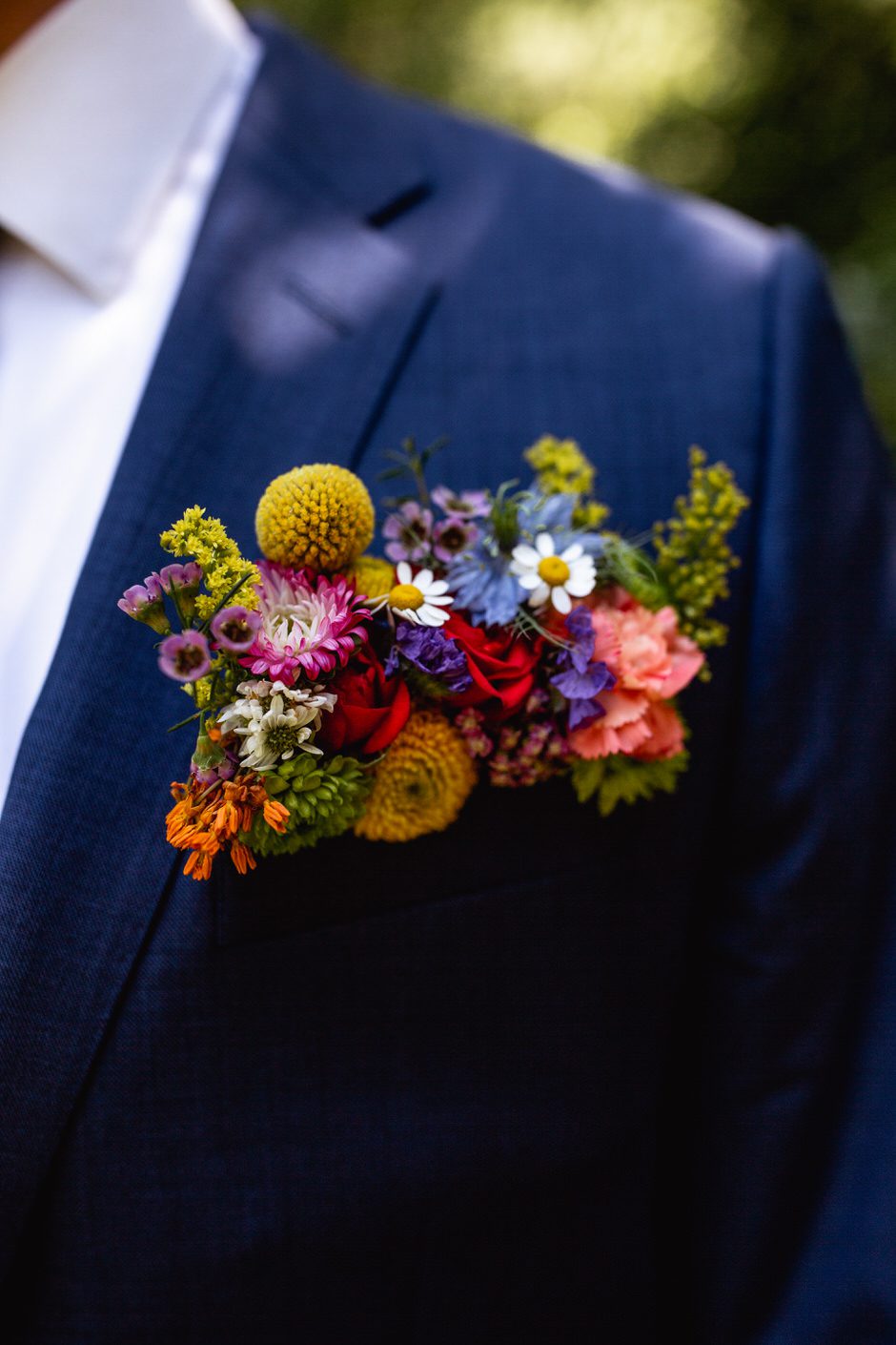 Because it was an outdoor wedding and in the middle of summer, I wasn’t 100% on board with the velvet material his suit was made of. I ended up going with a super comfortable, and breathable suit from J. Crew that I’ll continue to wear for special occasions in the future. All things considered, my wildflower corsage pocket square was probably my favorite part of the outfit. All Occasions in Ludington, MI, did an awesome job putting it together!