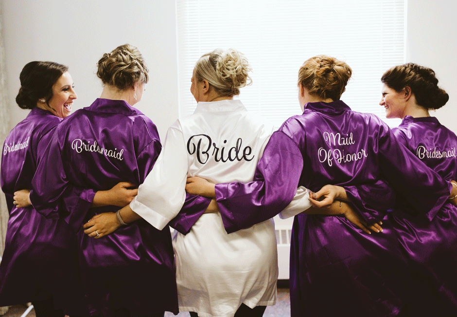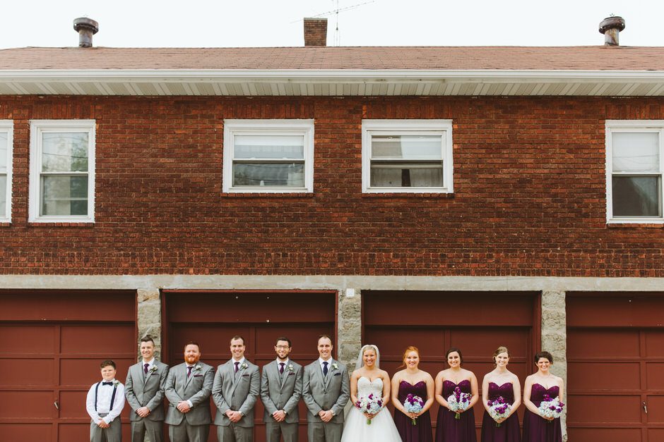 We decided to go a more modern route and did custom suits from Jos A Banks rather than tuxes. Doing a custom suit we were able to design the guys’ look exactly the way Sean wanted and chose a sharkskin grey, 3-piece, slim fit suit. The groom’s accessories were navy blue because that is the color that represented him in the wedding. We wanted the groomsmen’s accessories to match the bridesmaids’ dresses, but the bride picked an “eggplant” colored bridesmaid dress which was a very difficult color to match in men’s suit accessories. We searched for weeks to find the groomsmen’s ties. We were unable to find affordable pockets squares that matched, so we had the bride’s mother and sister make pockets squares from fabric that matched the bridesmaids dresses exactly. The groom’s favorite part of the entire ensemble was the matching goofy socks he bought for himself and all of the groomsmen. That way there was a little bit of Sean’s style underneath everything. Not only did the men look dapper on the wedding day, but all of the guys now have a custom fit suit to keep after the big day! We think they will definitely be put to good use. In fact, we’re pretty sure we’ve seen the best man in his suit outside of the wedding already. 😉