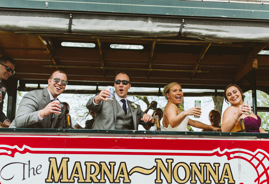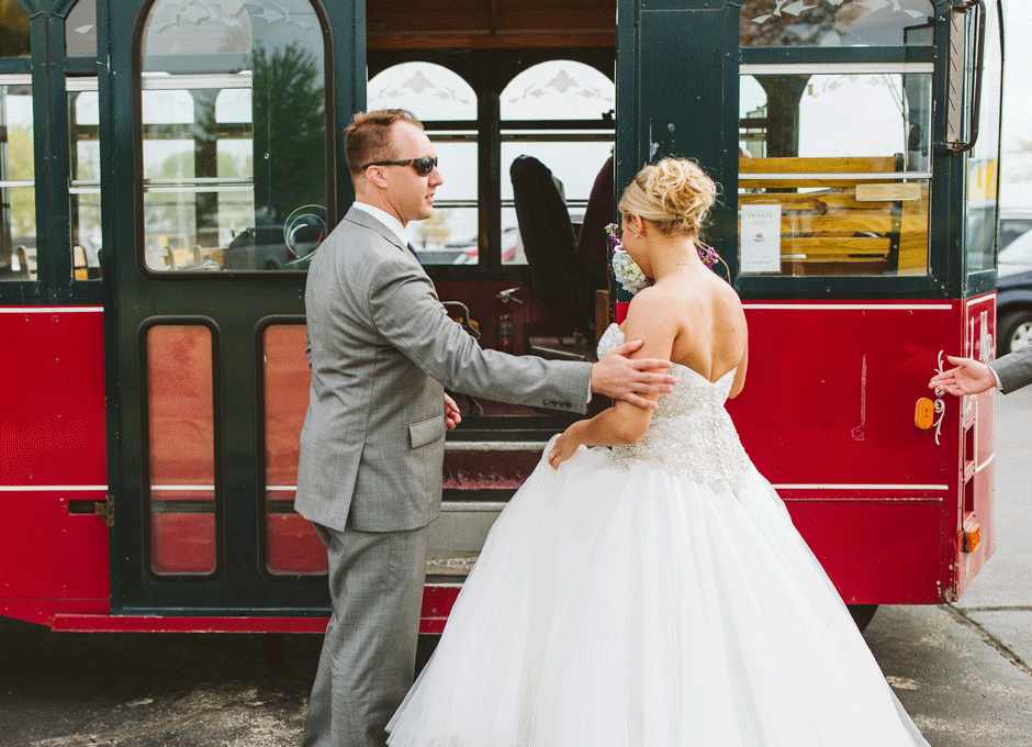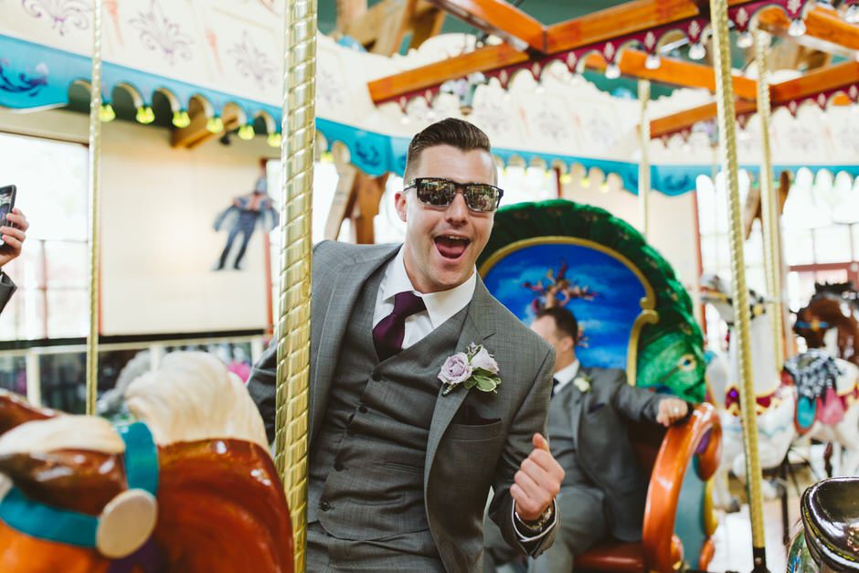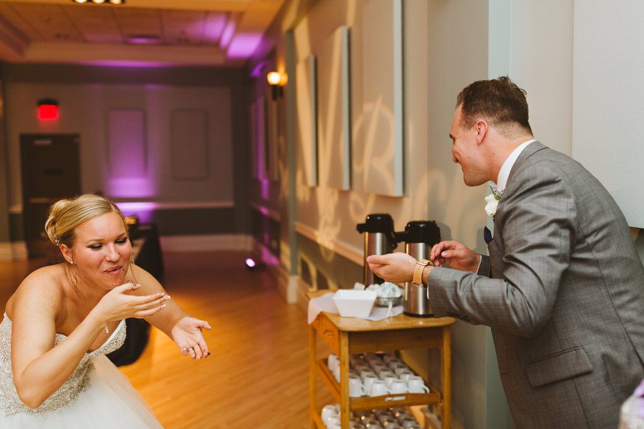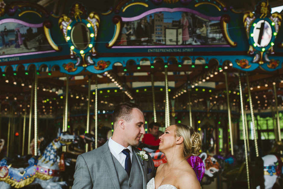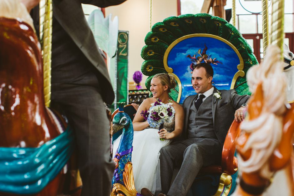 For our wedding reception, we wanted to throw a once in a lifetime party. Thanks to all of our vendors, we were able to make that happen. Our reception venue, Shadowland Ballroom provided our tasty appetizers and dinner. They also provided the alcohol or the bar, allowing us to feature and enjoy some of our favorite local drinks such as Vandermill ciders, Bell’s Oberon, and our favorite local wines such as Gravity’s Michigan Magnetism. The best part of the bar, however, was Shadowland’s house special sangrias: white strawberry sangria and red berry sangria. The bar choices were definitely a hit with our guests! Our baker, Country Cottage Bakery, provided our gorgeous wedding cake and yummy desserts. We even rented the Silver Beach Carousel for half an hour so that our guests and wedding party could have private carousel rides. The carousel rental gave us the experience to remember and also provided some very memorable pictures.