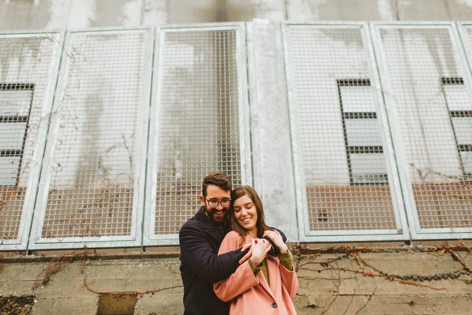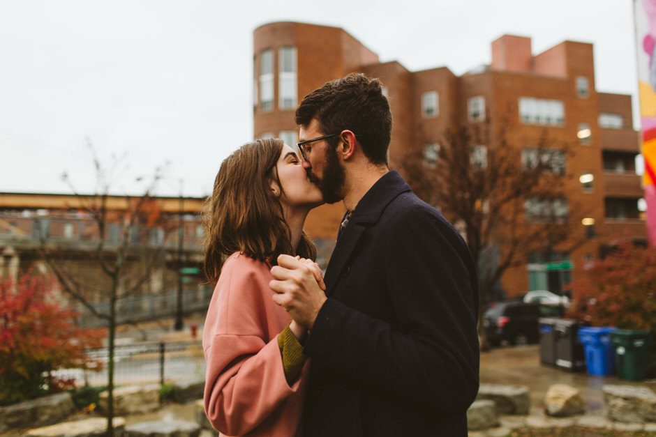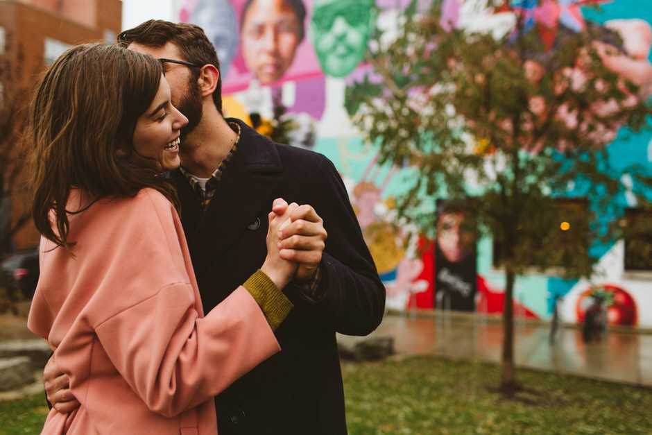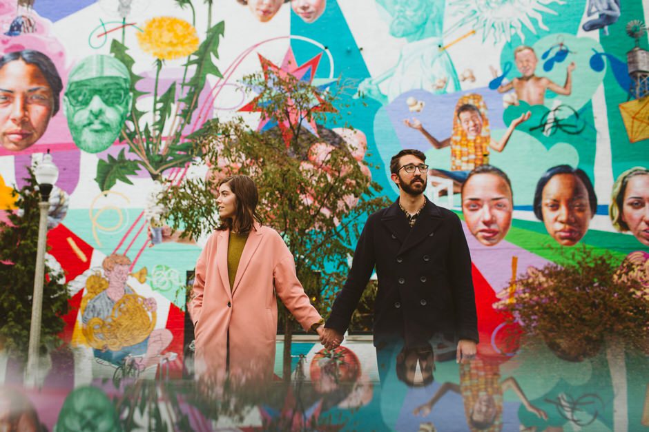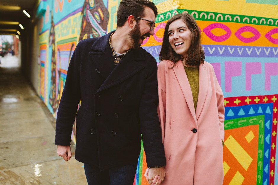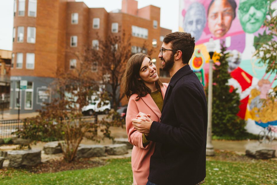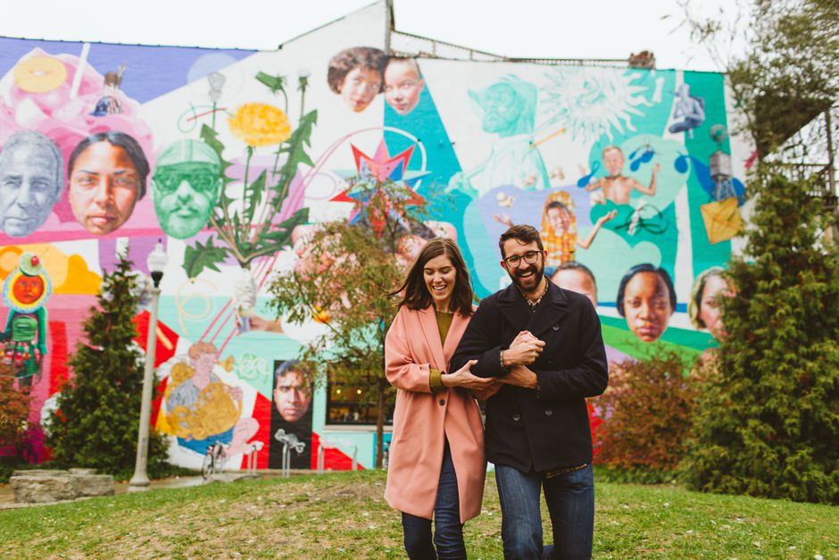 We scheduled this engagement session for what should have been a gorgeous November day. It poured, all dang day. Then, moments, before we were supposed to meet up it cleared up quite a bit and we decided to meet up around Brads neighboorhood to get to know each other and check out some rad murals around town. They are getting married next summer at one of my FAVORITE venues and I am so pumped to hang out with them again.