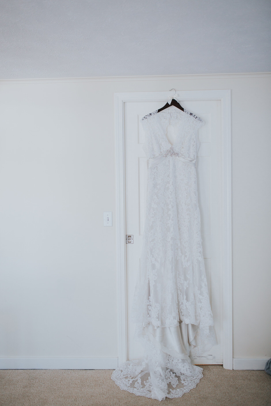 I wish there was a cool story about my dress, but it all happened so casually. I stopped into a bridal shop on my lunch break to see how far in advance I would have to start looking. I saw a few dresses I liked on the floor and asked if I could try a few on to get an idea before coming back with family and friends. I fell in love with the first one I put on and walked out with it that day. It was a sample dress, which really just means other people have tried it on. I didn’t want to spend thousands on something I would wear once. It was altered a tiny bit and professionally cleaned. It was an Allure lace A-line gown, with a champagne underlay and keyhole back. I was so comfortable in it and sad I only got to wear it once….except on our anniversary photo shoots which Rachel has suggested over my idea of having another wedding!