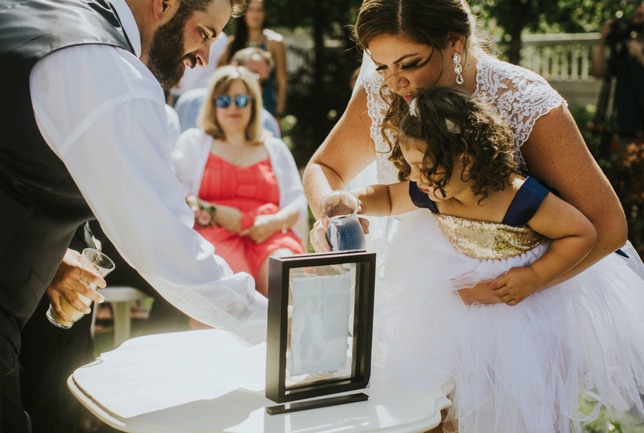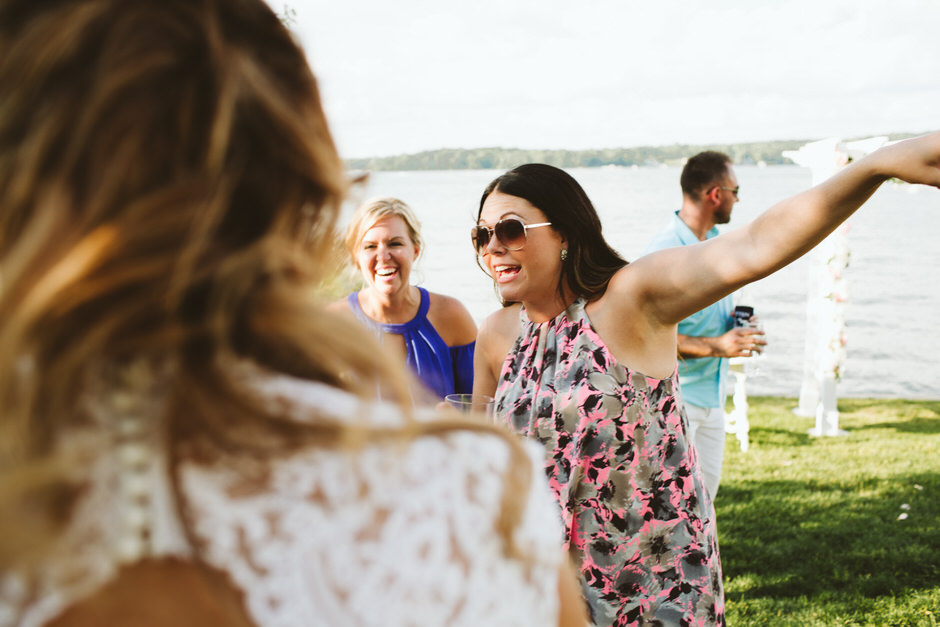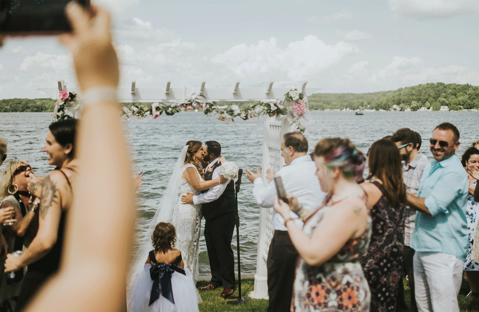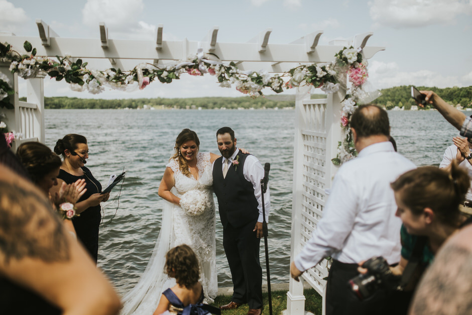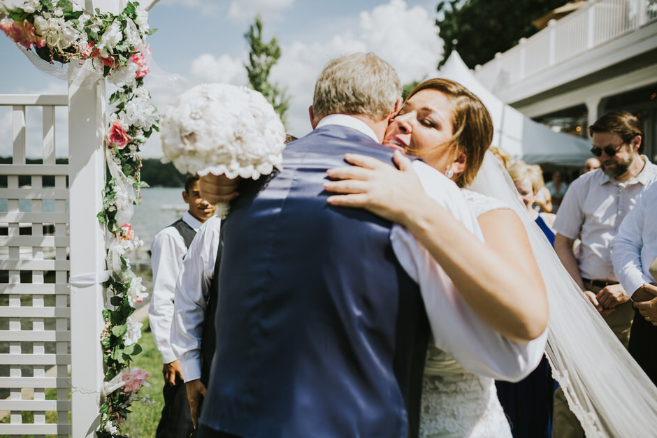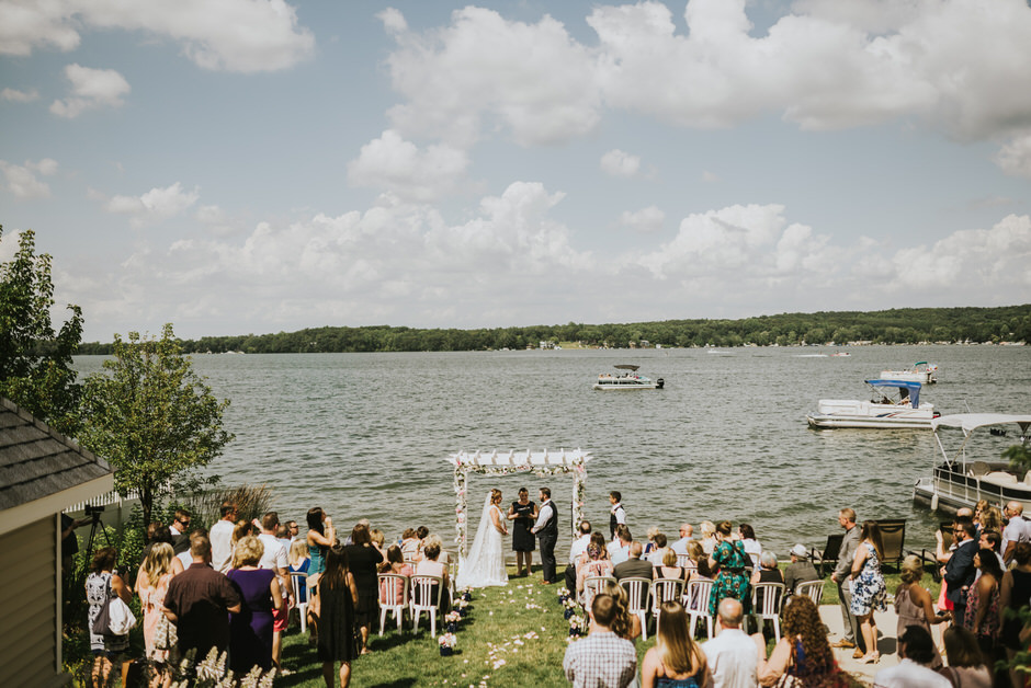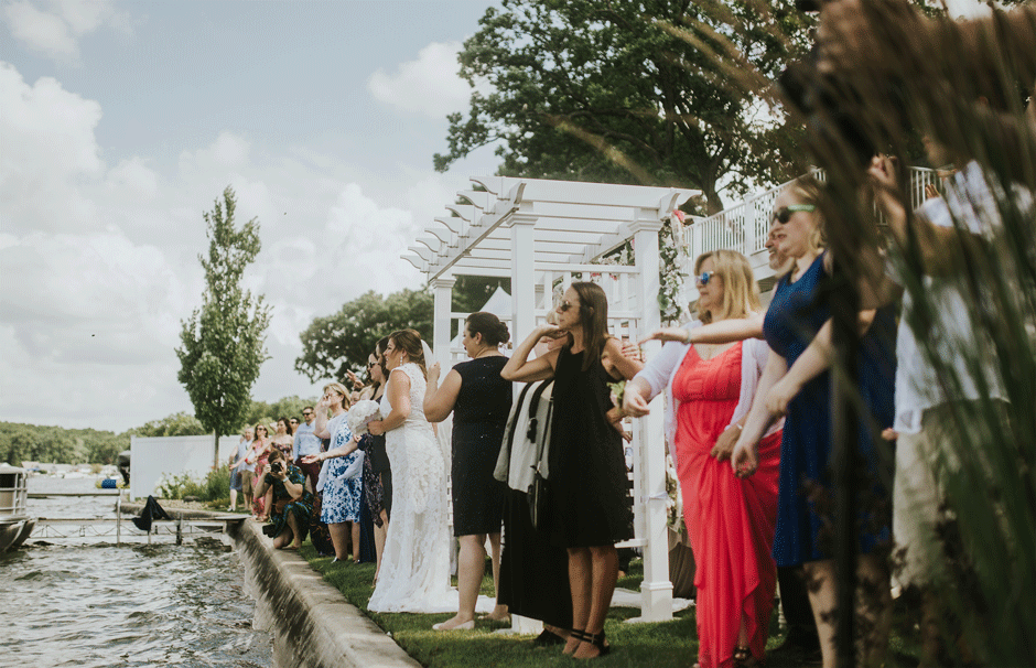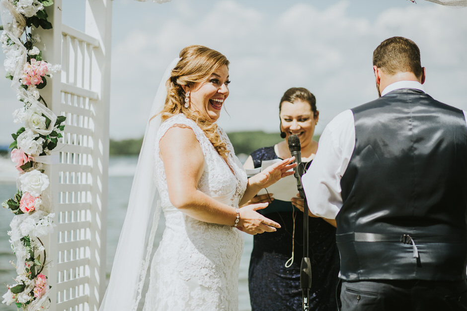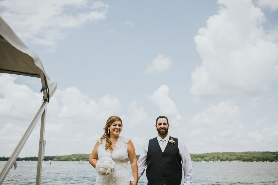 The ceremony was my absolute favorite part of the day. We wanted it to include not only Ryan and I joining our lives and our children’s lives, but also all of our “people”. We did not have a bridal party, so we had our kids alongside us. I asked my best friend from childhood, Erin Roenna to officiate and lucky for us, she agreed! Erin did such an amazing job of incorporating emotion, humor, and sentiment into the perfect ceremony. I don’t think I could have asked for a better ceremony. We performed a sand ceremony to unite our lives and included Jake and Lia. “These grains of sand are now mixed together and can never be separated.” The other thing we did was a “blessing stone ceremony”. All of our guests were given a river rock to hold during our ceremony. At the end, everyone was asked to make a wish or blessing for our marriage on their rock and we all threw them into the lake at the same time. As Erin explained “The ripples that are made in the water represent the love and good wishes not only for this couple but for all the world. For as our ripples cross and recross one another’s, so our love and good wishes touch and retouch all those around us.” We then exited the ceremony on a pontoon boat!