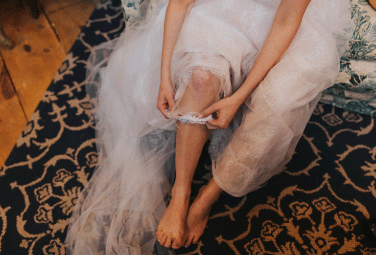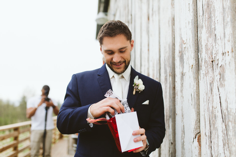 groom holding a box which says bring day of weddinggirl lint rolling blue suit jacket guy in blue suit with glasses showing something on his phoneall dresses hanging upThe Ceremony: How did it go? Anything special?