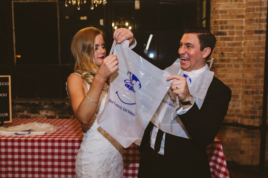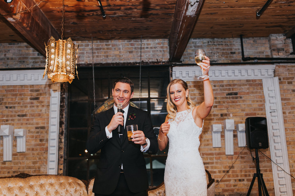 Salvage One was the perfect place for our Chicago Winter Wedding. The assortment of beautiful antiques made being stuck inside not so bad. Salvage One was unique, romantic, cozy, moody, and everything else we could have wanted in a venue. The Bride’s favorites: vintage church pews for our guest seating during the ceremony, countless vintage chandeliers, and the stunning stained glass. The Groom’s favorites: massive stone elephants that frame the wedding aisle, the trendy yet extremely cozy suites for the groomsmen and bridesmaids, and the gorgeous vintage bars.